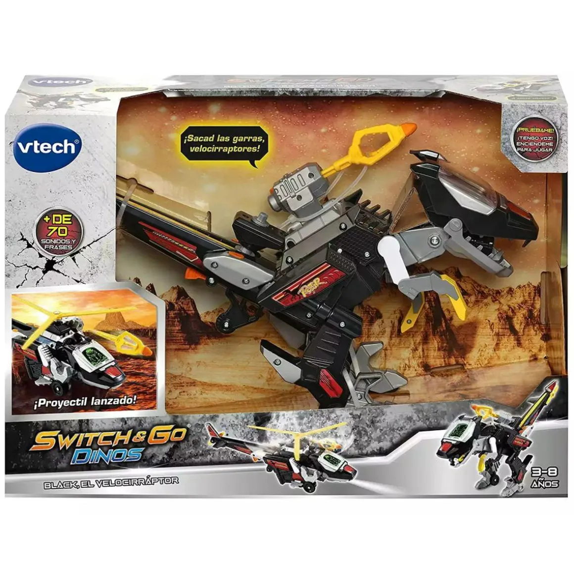 ¡Transforma tu diversión con VTech – Switch & Go Dinos Black el Velocirráptor! Este juguete ingenioso y educativo no solo te permite jugar con un Velocirráptor, sino que también se convierte fácil y rápidamente en un helicóptero de combate.