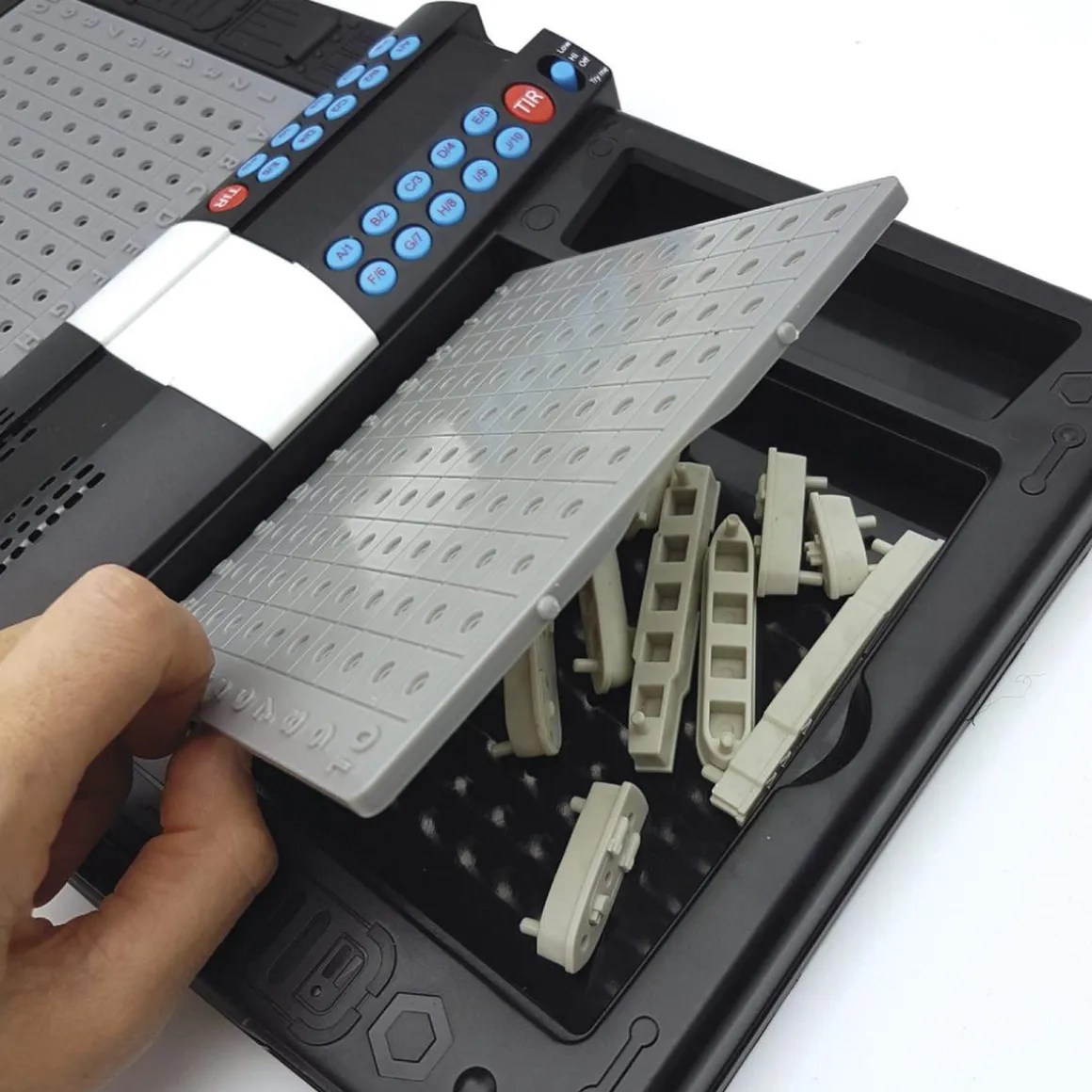 Dos tableros de juego con 10 buques de guerra y pines blancos y rojos para marcar el agua y la situación de los buques de tu oponente. Una caja maletín para mantenerlo todo guardado y organizado.