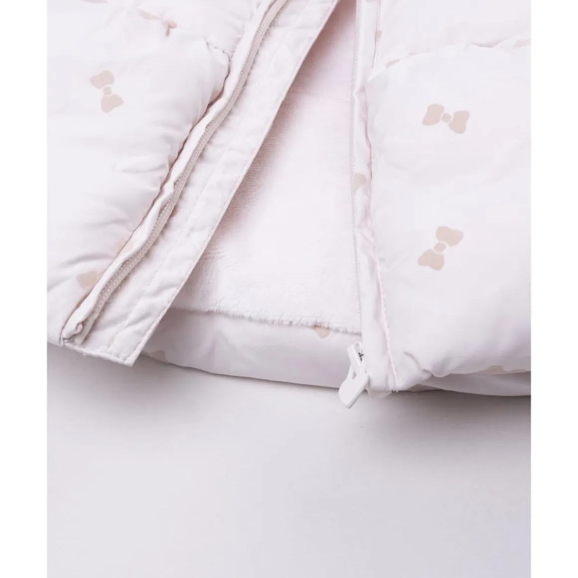 El abrigo en tono rosa con estampado de lazos allover es cálido y encantador. Confeccionado con capucha y cierre de cremallera en la parte frontal, ofrece un ajuste práctico y cómodo.