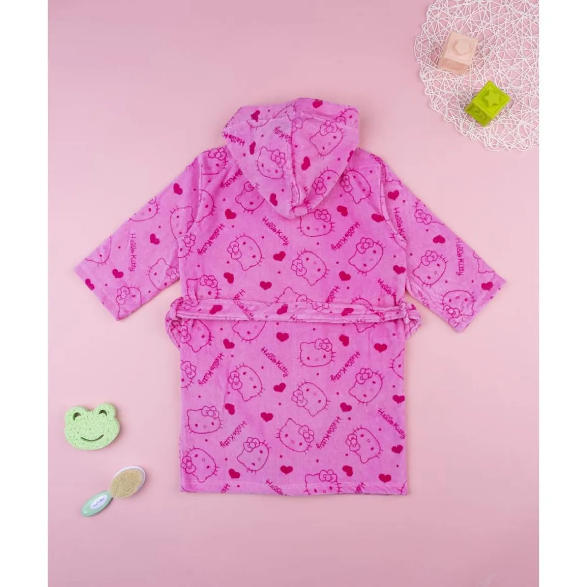 Este albornoz para niña está confeccionado en algodón rizo suave y absorbente. Se presenta en color fucsia con estampado integral de Hello Kitty, acompañado de capucha y cinturón a juego para un ajuste práctico y cómodo.