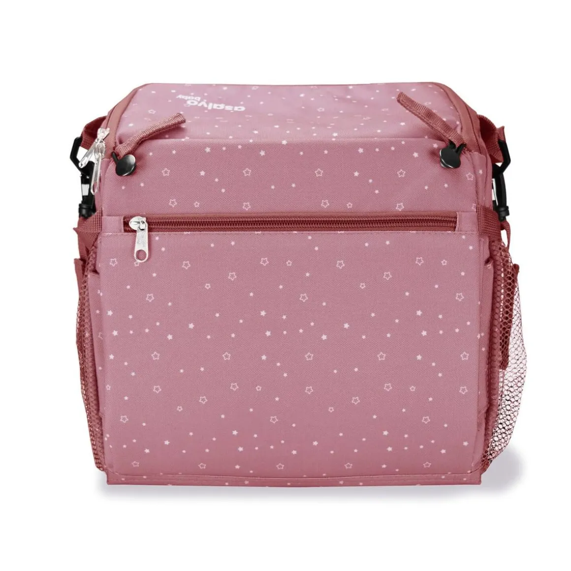 Asalvo – Trona de viage-Bolso Hummus Estrellas Rosa. Viaja cómodamente con tu bebé gracias a la trona de viaje Hummus.