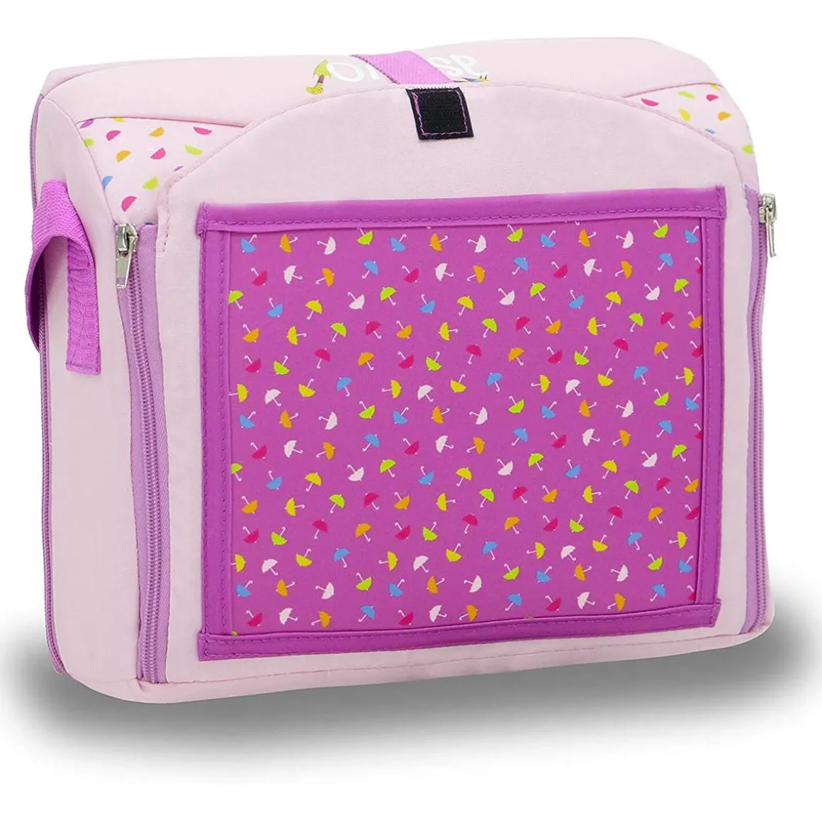Dispone de una práctica asa de transporte, y su tejido es de alta densidad, contando, además, con un bolsillo súper útil. Su respaldo se eleva hasta una altura de 25 cm y cuenta con arnés de seguridad.