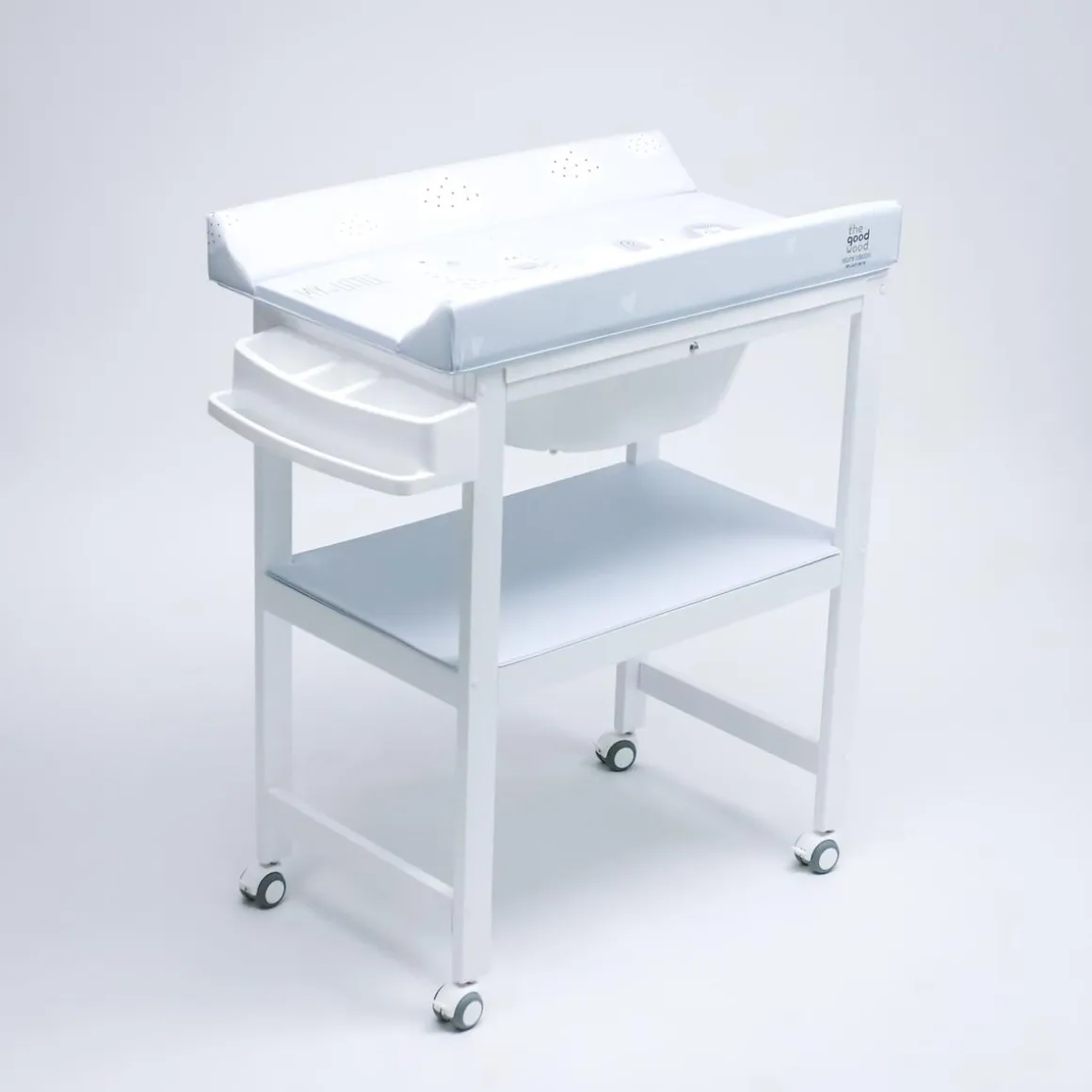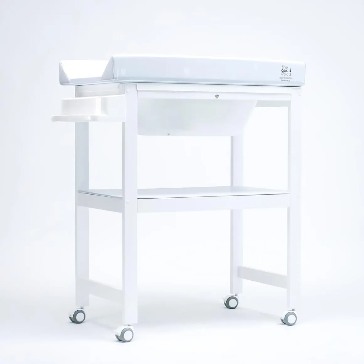 Tiene la cubeta rigida y, además, dispone de una estanteria de madera forrada de PVC muy práctica, para que puedas almacenar todo lo que necesita el bebé en el momento del baño. Cuenta también con manguera desagüe y cestas de plastico.