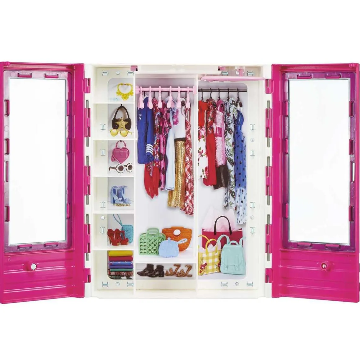 El armario cuenta con perchero extensible y muchos compartimentos, ideal para guardar todos los accesorios de Ken y Barbie (NO incluidos).