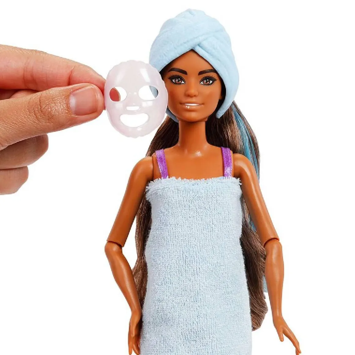 Incluye: la muñeca Purple Sparkle, vestido reversible (toalla/vestido), accesorios como zapatos, lazo, bolso, joyas, pincel sorpresa, tubo con slime y la mascota escondida.