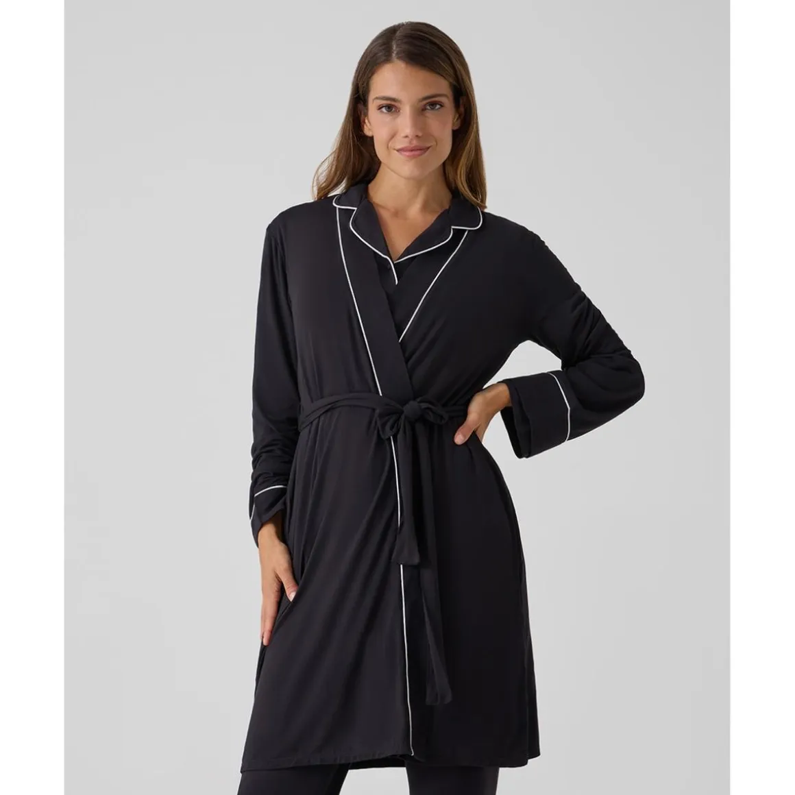 La bata premamá negra con ribetes blancos es elegante, cómoda y muy versátil. Diseñada con manga larga y un cinturón de lazo, se adapta tanto durante el embarazo como en la lactancia.