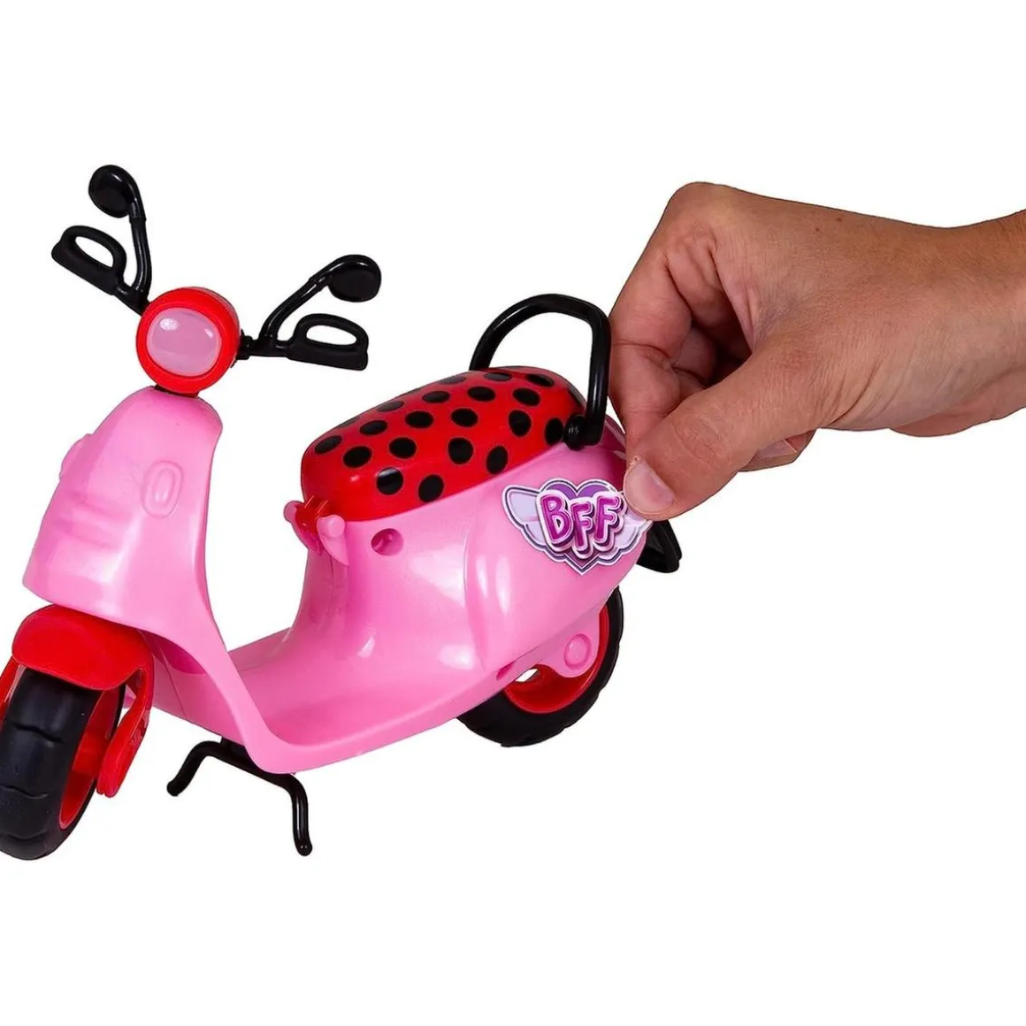 La BFF Series 3 Lady’s Scooter viene con dos prendas de ropa, zapatos, un casco y un accesorio para el pelo para que «Lady» siempre esté preparada para toda ocasión. Hay más, incluye un bolso y un accesorio personalizado para tu muñeca. También viene con una hoja de pegatinas y un collar BFF para que la amistad sea aún más sólida. Con estos innumerables accesorios, las posibilidades de diversión y aventura son infinitas.
