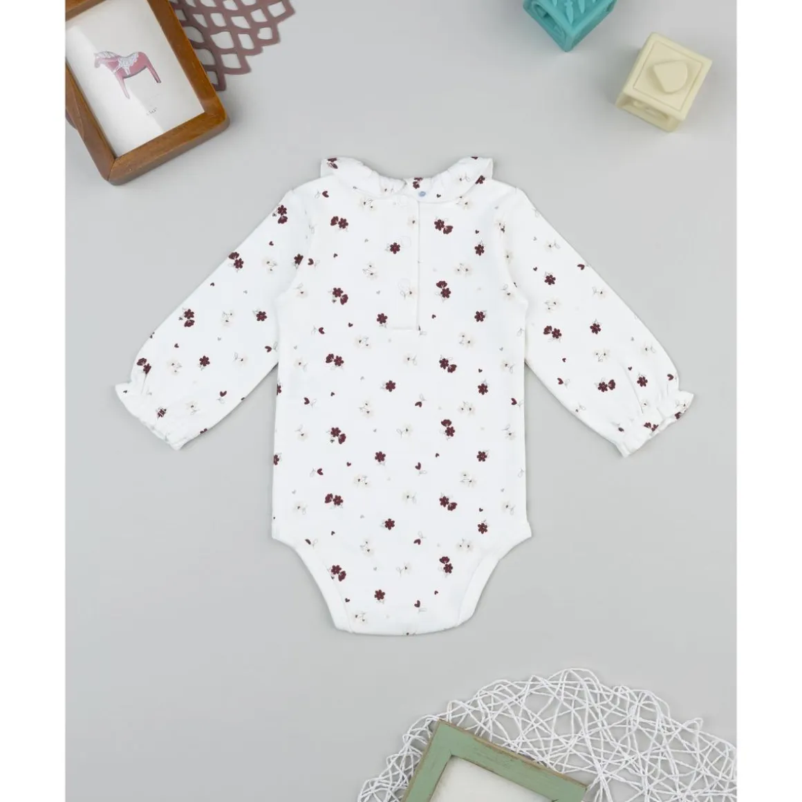 El body de manga larga para niña en blanco crema suma elegancia y funcionalidad. Luce un estampado floral continuo muy suave y un clásico cuello Peter Pan que viste por sí mismo bajo chaquetas o peleles. Los corchetes en la entrepierna y en la espalda agilizan el cambio de pañal y el vestido, mientras que el punto de algodón certificado Oeko-Tex mima la piel con transpirabilidad y tacto dulce.