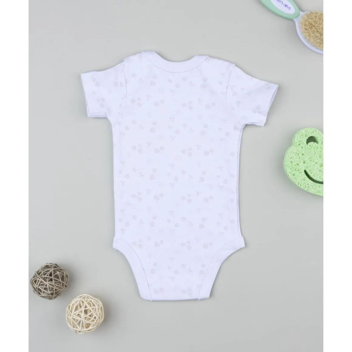 Este body de bebé de manga corta está confeccionado en algodón felpado certificado OEKO-TEX. Se presenta en color blanco con estampado allover de pequeñas flores. Con cuello americano y corchetes en la entrepierna, garantiza comodidad y facilidad en el cambio.