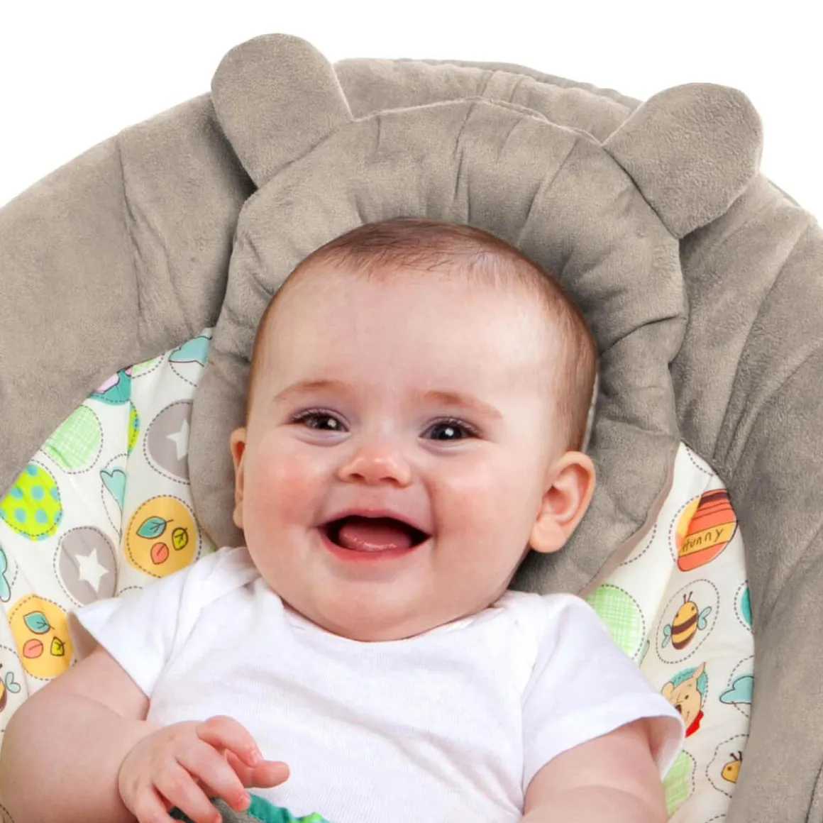 Incluye un arnés holgado y suave para su seguridad, un arco de quita y pon con figuras de Winnie The Pooh que crearán interés en el bebé y estimularán su coordinación motriz y su sentido visual, y un reposacabezas extraíble.