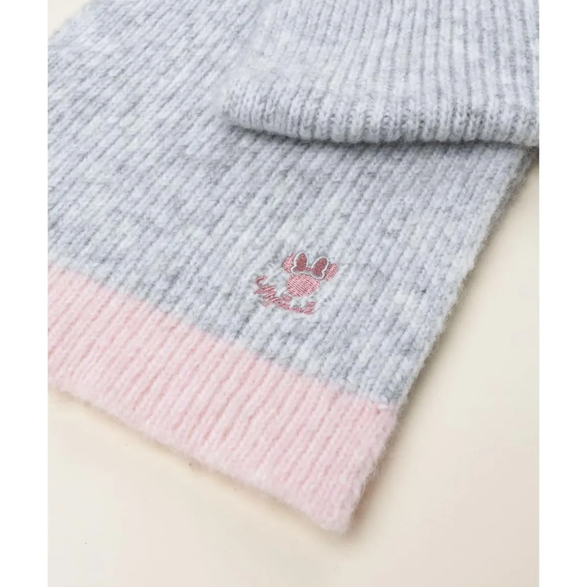 Bufanda tricot casual para niña en gris claro con bordado de Minnie en rosa coordinado. Su suavidad y manejabilidad la hacen cómoda para usar en cualquier ocasión casual, combinando fácilmente con otros accesorios de invierno.