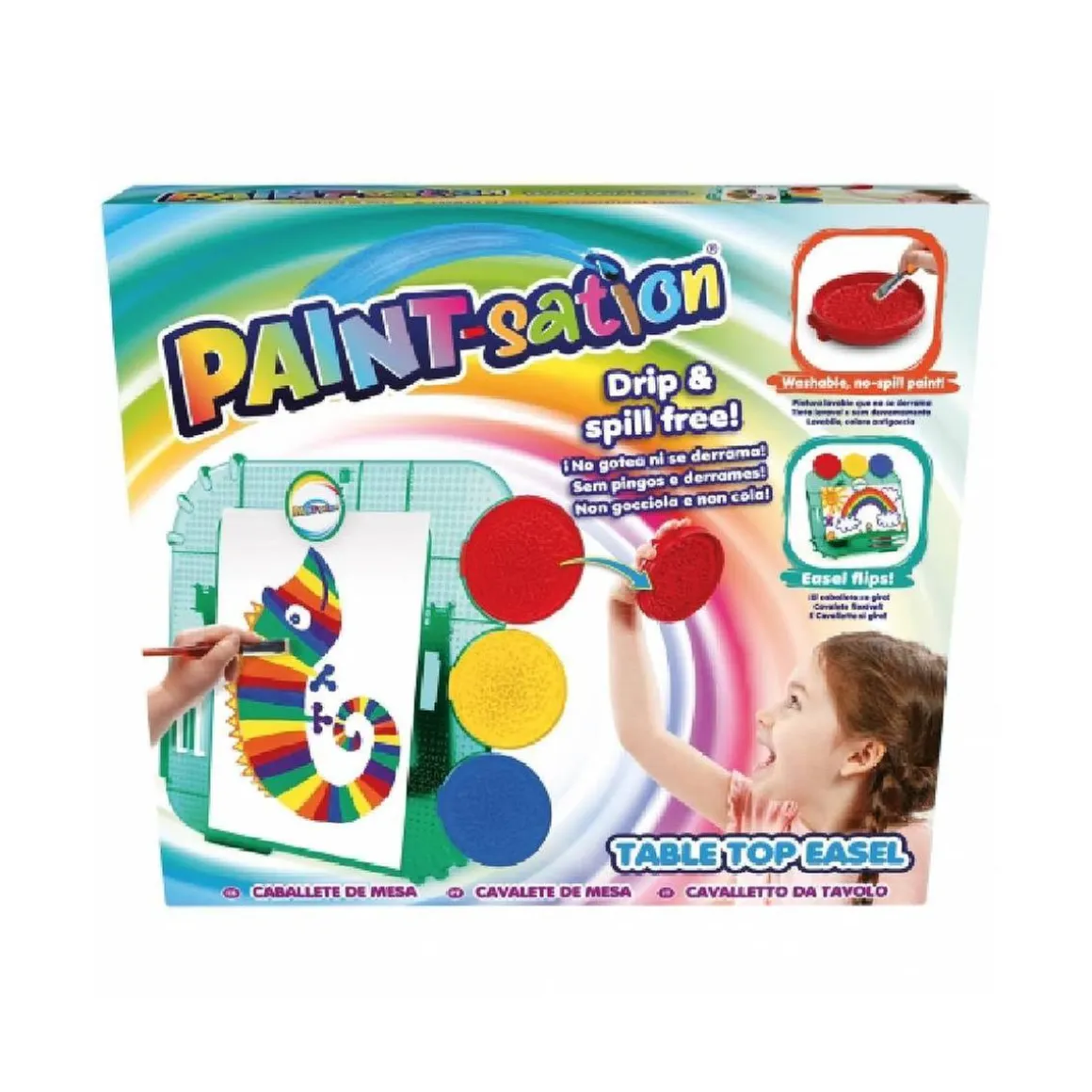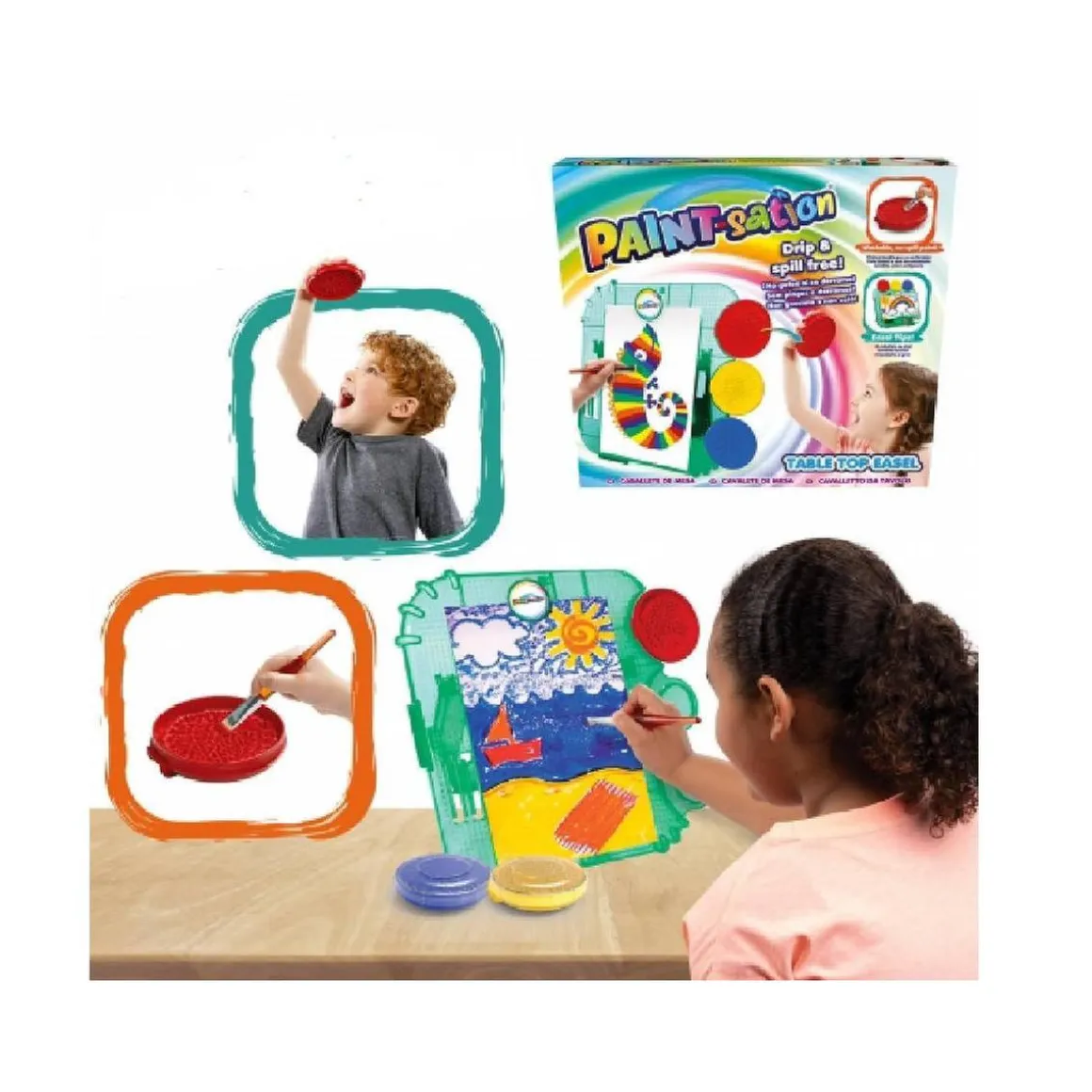 Caballete de mesa, con pintura lavable que no gotea ni se derrama.