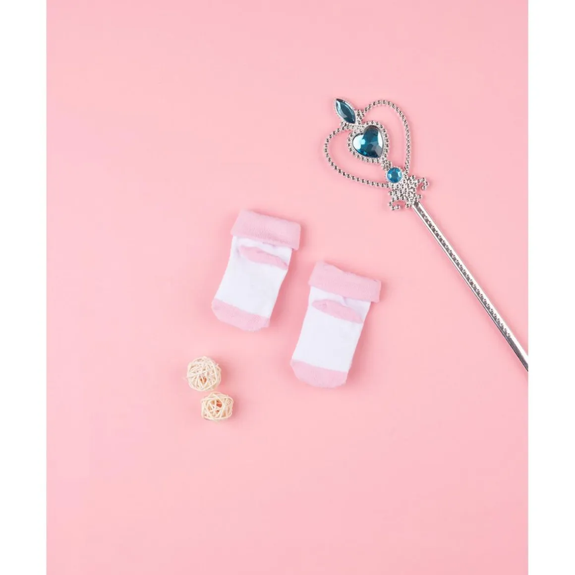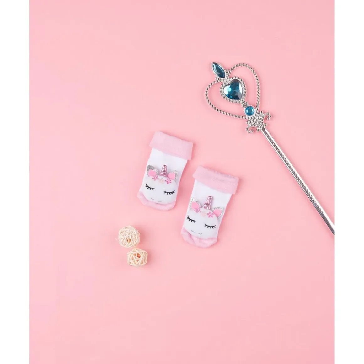 Encantadores calcetines con sonajero para niña. Diseño en blanco y rosa claro con un bonito unicornio en relieve con detalles en purpurina plateada.