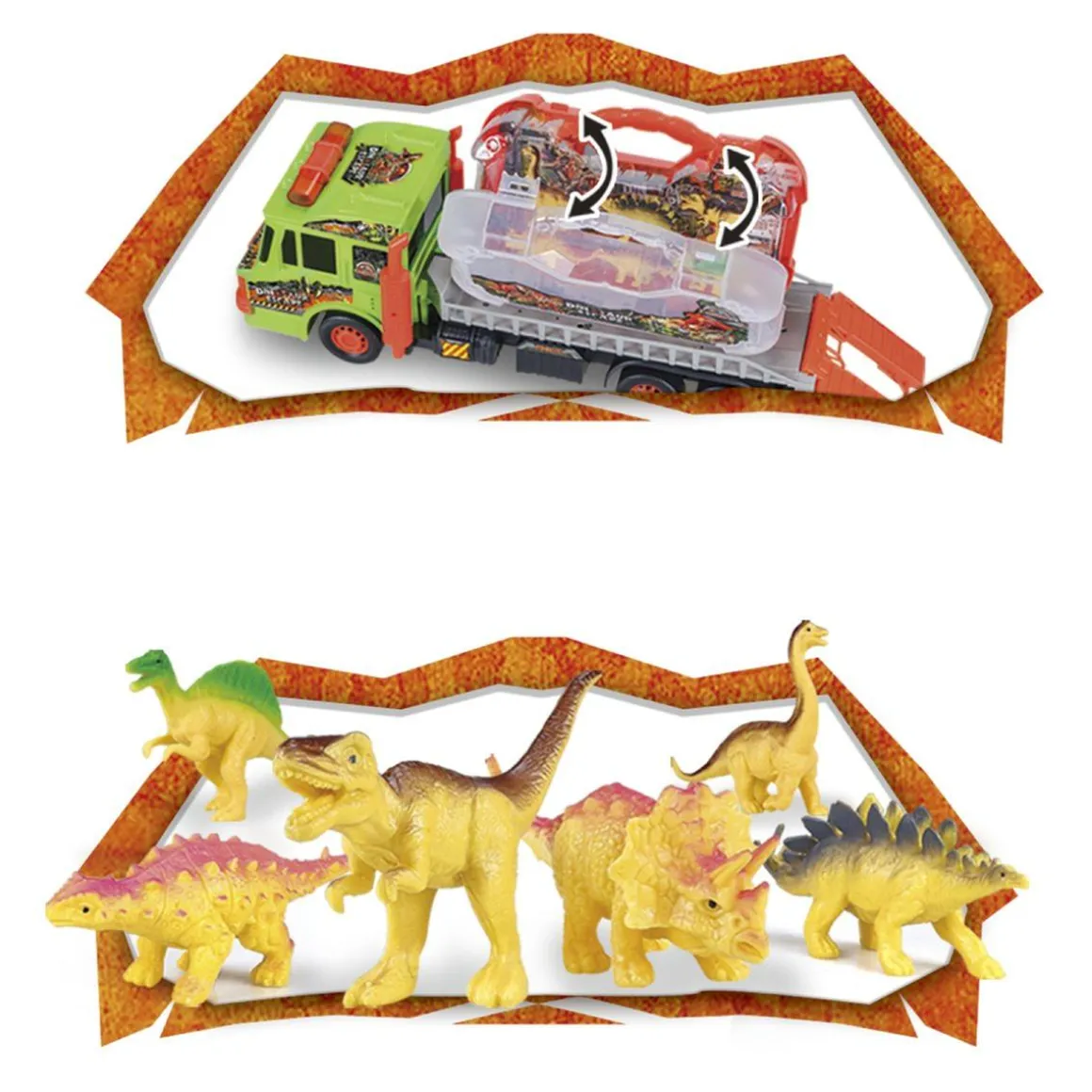 El primer remolque incluye una jaula abatible con brazo móvil y gancho para levantar y abrir la jaula donde se encuentra un feroz dinosaurio listo para escapar. El segundo remolque incorpora una valigeta portátil con 6 dinosaurios, que se puede transportar a cualquier lugar para continuar la diversión y crear nuevas misiones.