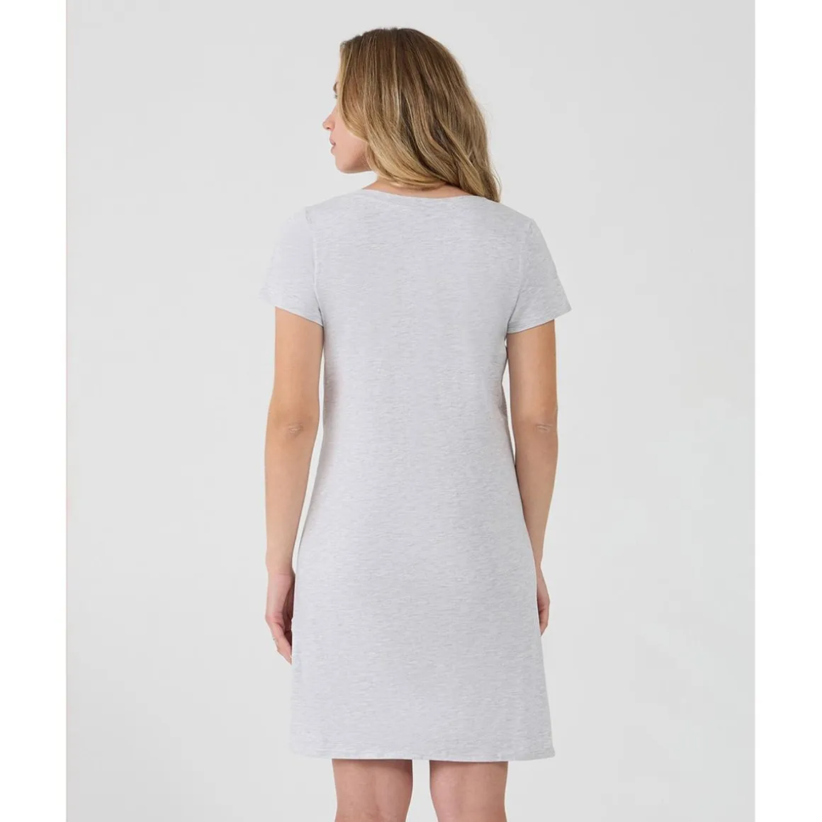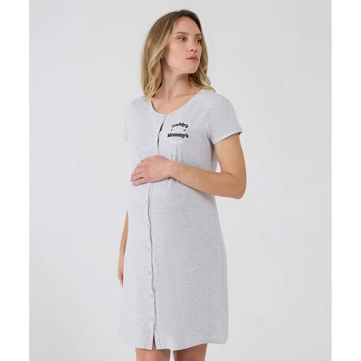 Camisa de noche para parto color gris claro, con dulce estampado “Daddy’s love, Mommy’s world”. La confección es amplia y confortable. La prenda presenta un práctico cierre con botones en el frente.