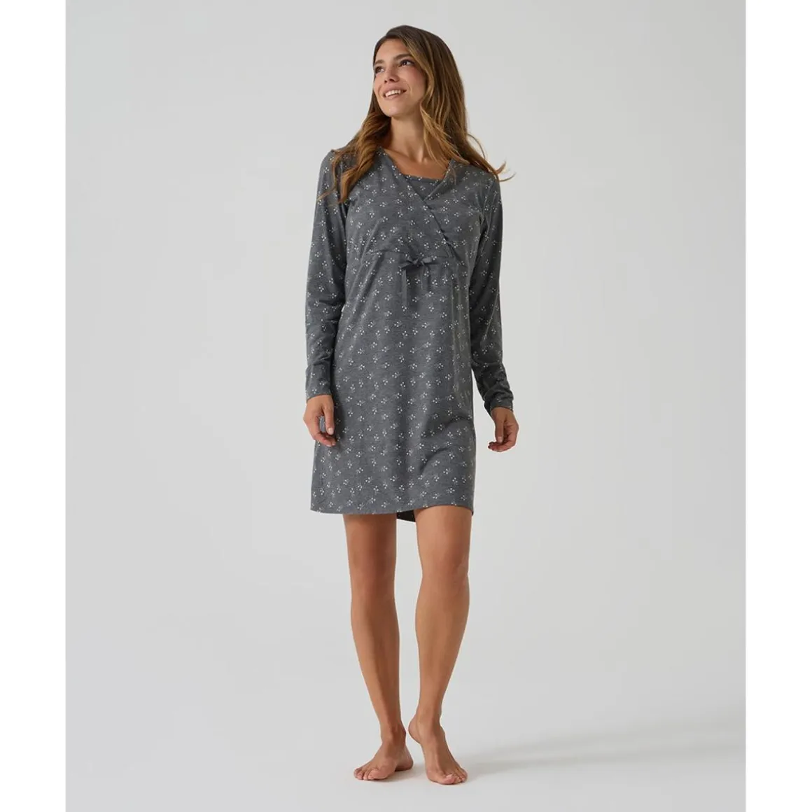 Elegante camisa de noche para embarazo y lactancia en tono gris oscuro con estampado de flores blancas en toda la superficie. Cuenta con escote cruzado en el delantero que facilita la lactancia y una cuerda regulable bajo el pecho que permite ajustar la prenda a medida que la barriga crece.