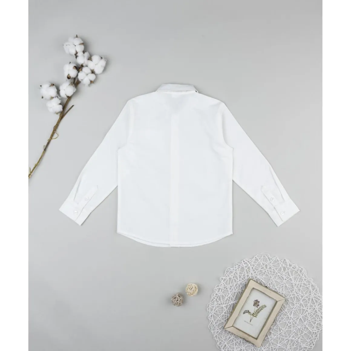Elegante camisa de manga larga para niño confeccionada en suave algodón blanco, con bolsillo tipo parche y pajarita azul a juego. Su cierre de botones en tono aporta un acabado pulido y fácil de vestir.