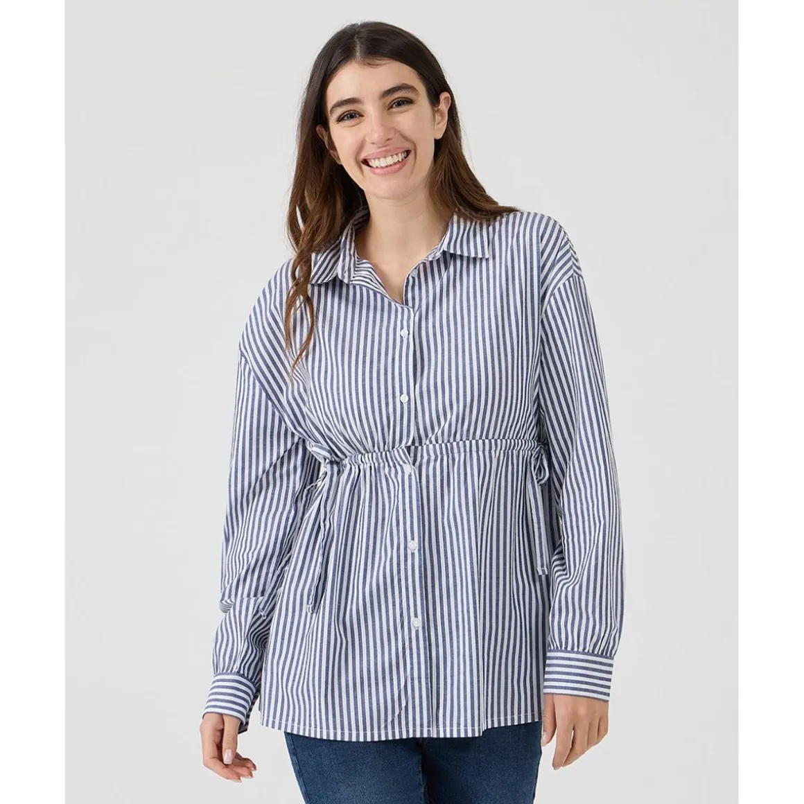 Camisa premamá de popelina de algodón con estampado de rayas blancas y azules. La camisa presenta un cordón bajo el busto, que permite ajustar el ajuste durante todo el embarazo. El cierre en la parte delantera con botones hace que la prenda sea cómoda también para la lactancia.