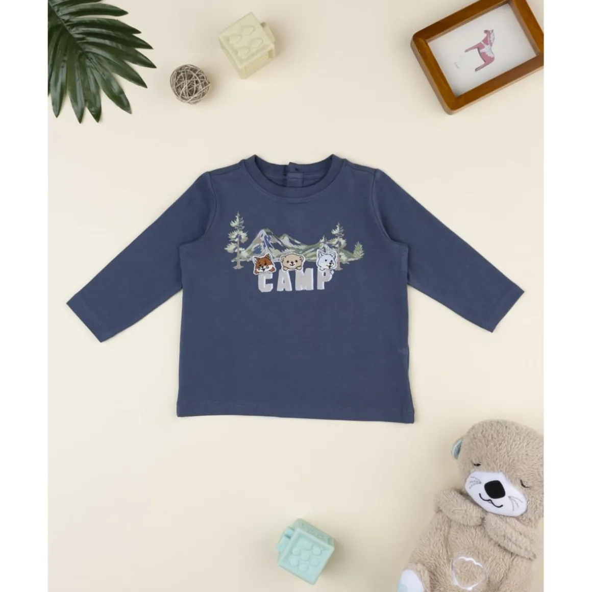 Esta camiseta infantil de manga corta en tono azul incorpora un estampado de estilo montaña en la parte frontal, evocando aventuras al aire libre. Su cuello redondo y cierre con botones a presión en la espalda garantizan facilidad de uso para los más pequeños. La prenda presenta una vestibilidad cómoda y ligera, ideal para el juego diario.