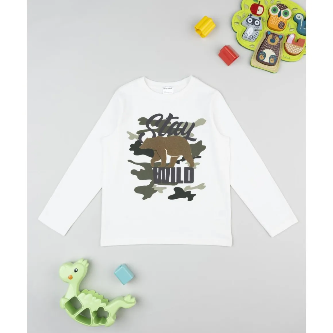 La camiseta blanca de manga larga para niño es un básico imprescindible. Con cuello redondo y corte amplio, presenta un estampado frontal de un oso en gran tamaño que aporta estilo moderno y simpático.
