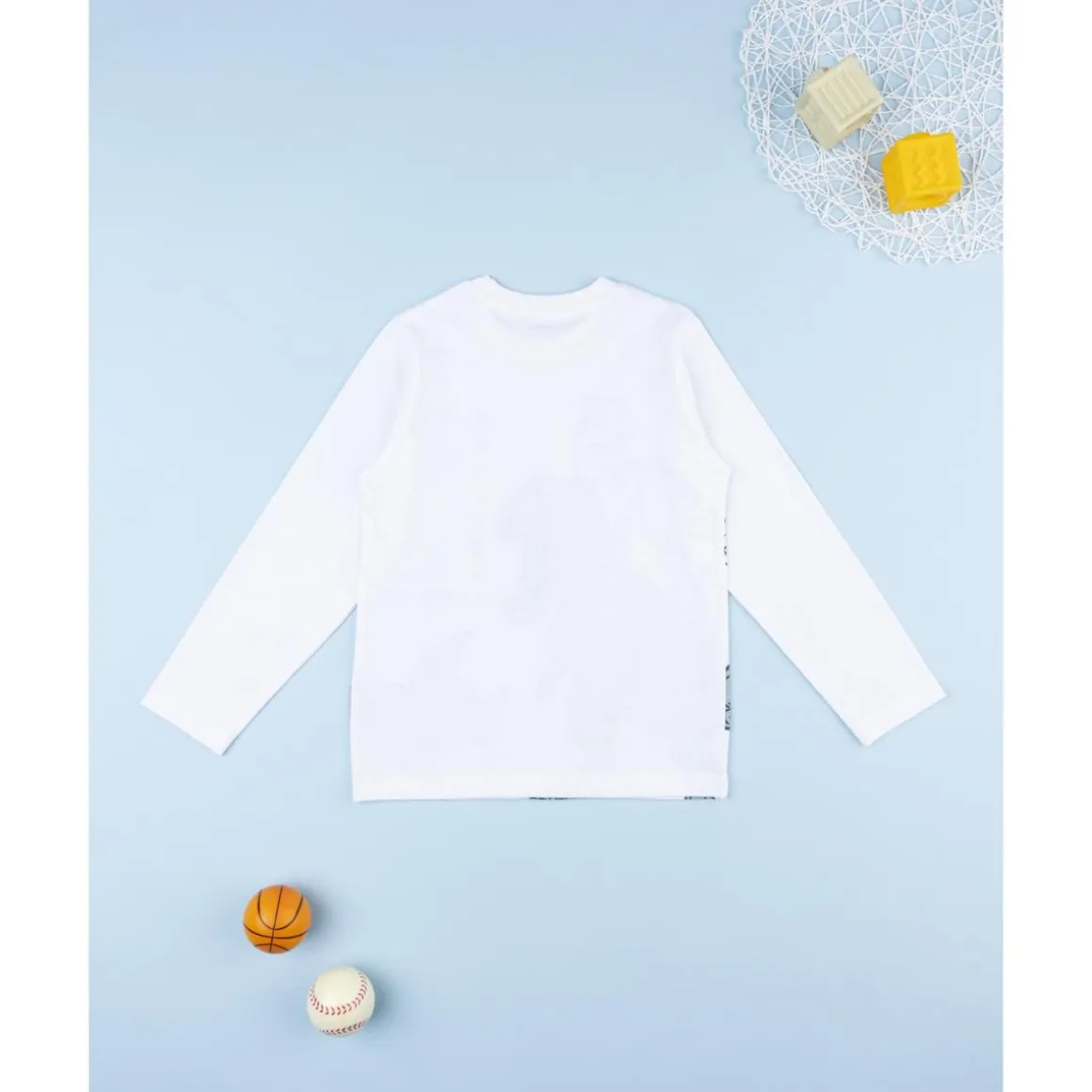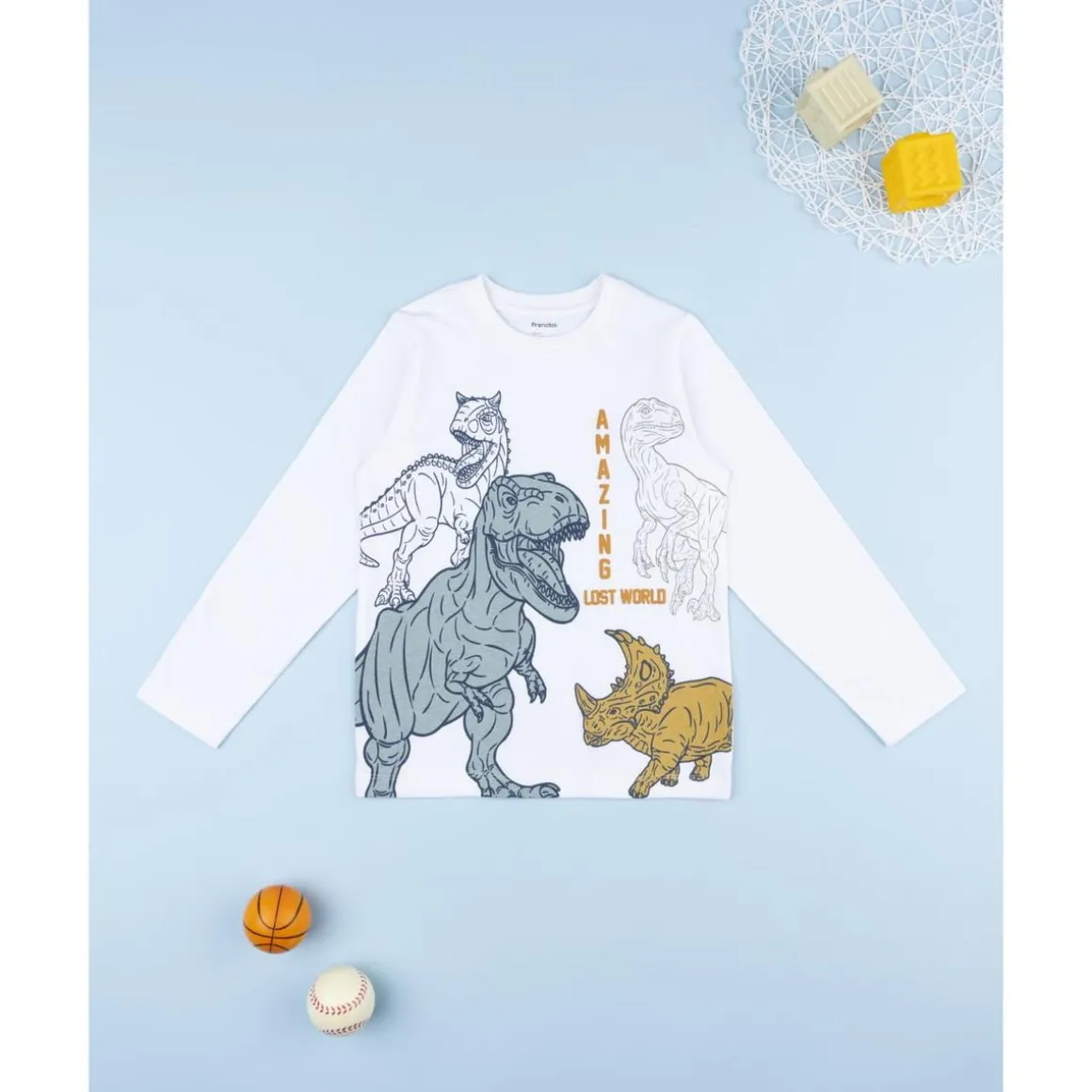 La camiseta blanca de manga larga destaca por su divertido estampado de dinosaurio en la parte frontal. Con tejido suave y corte recto, ofrece comodidad en el uso diario.