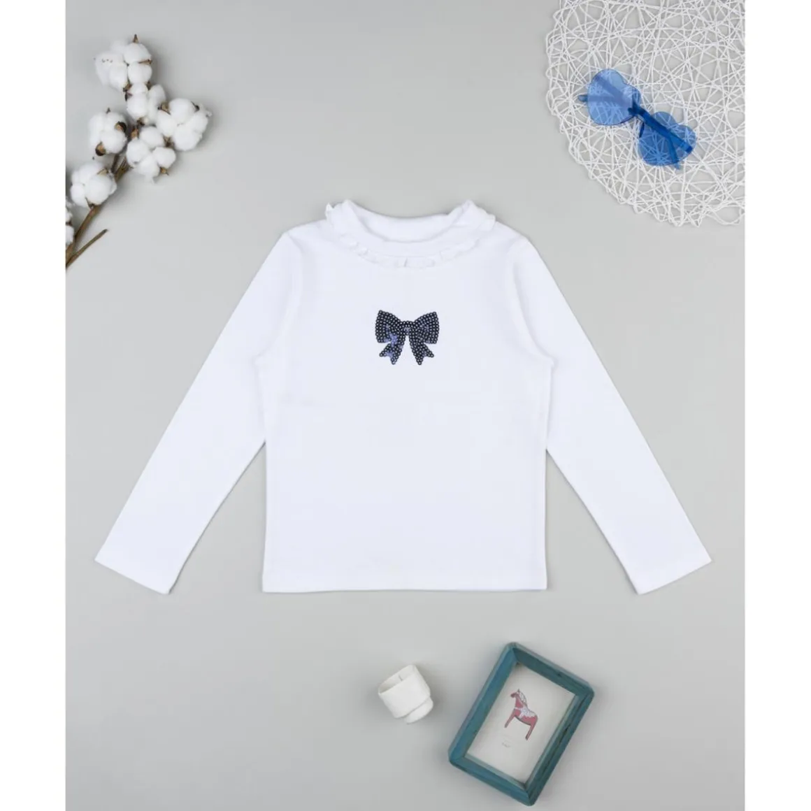Elegante camiseta de cuello alto para niña en color blanco, decorada con lazo azul de lentejuelas en el pecho. Su diseño sencillo y el tejido suave hacen de esta prenda un básico ideal para cualquier conjunto.