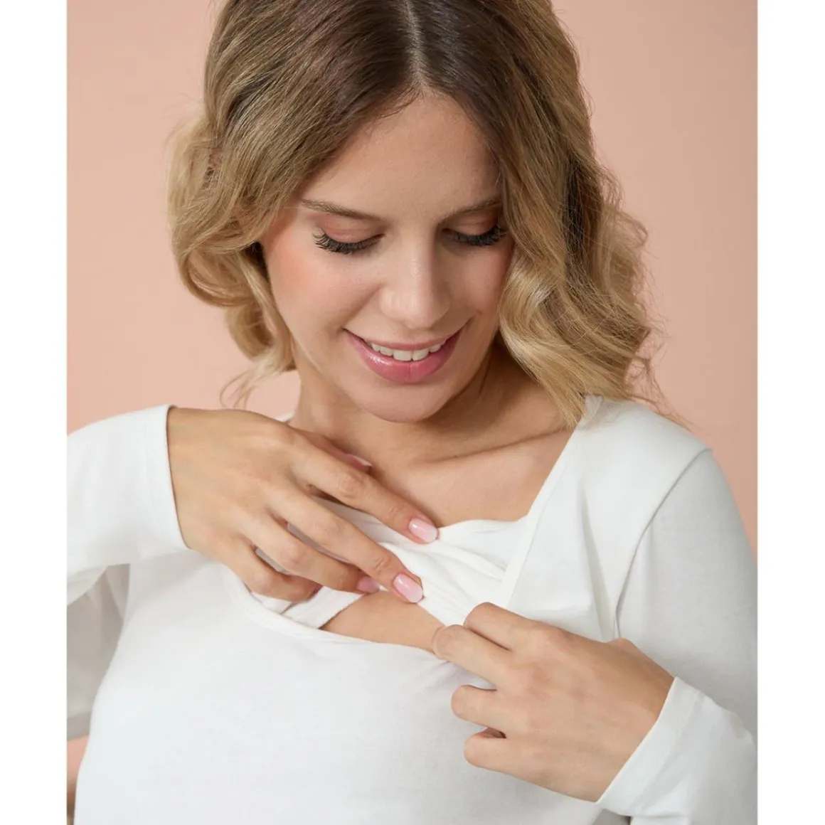 Camiseta de lactancia de manga larga en jersey elástico blanco con un ajuste cómodo. La prenda presenta un top inferior fácil de levantar, para permitir amamantar con toda comodidad. Gracias a la calidad elástica del tejido, la prenda se puede usar también durante el embarazo.