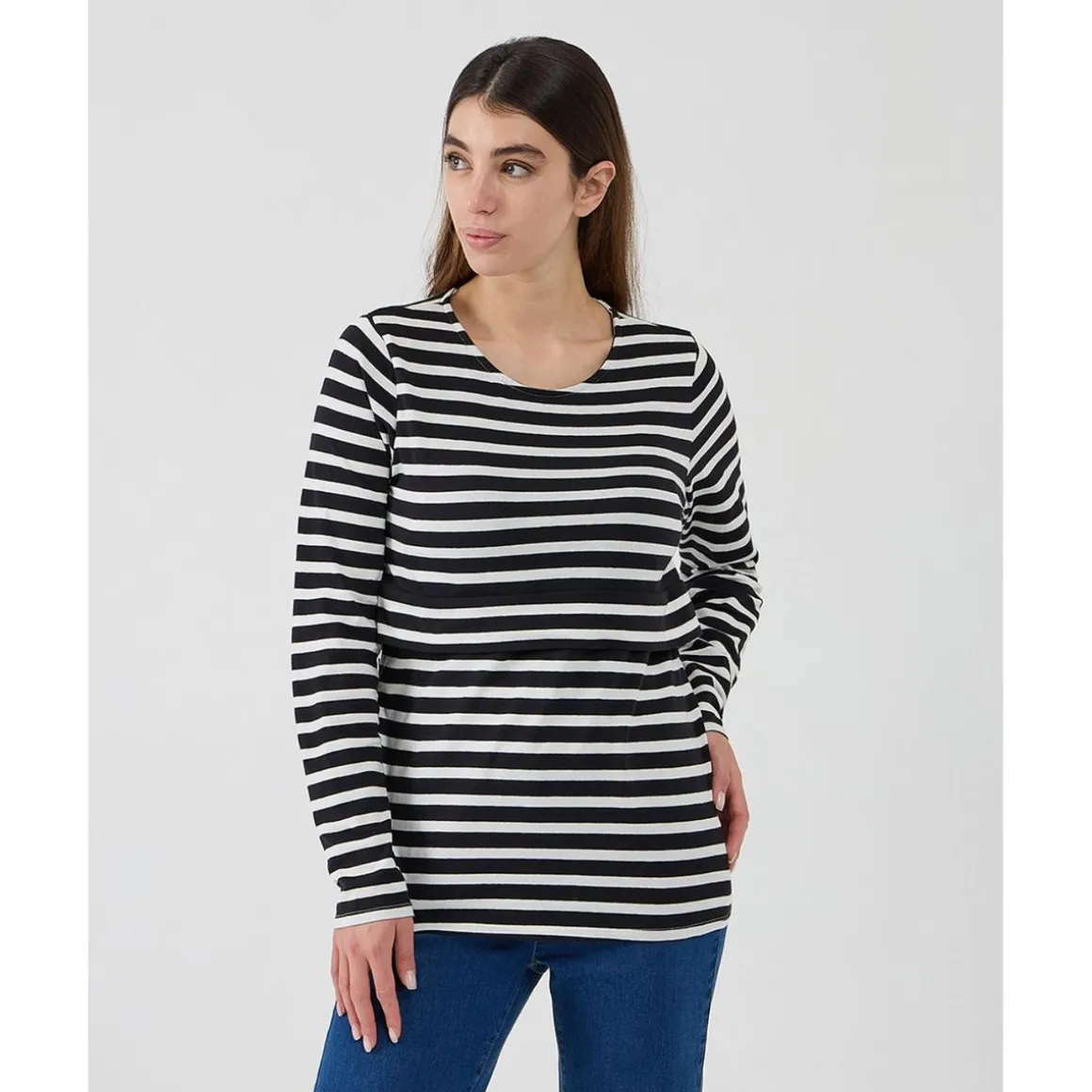 Camiseta de lactancia de algodón con estampado de rayas blancas y azules. La prenda presenta una capa superior, práctica de levantar, y aperturas laterales debajo, para amamantar con total comodidad. Con un ajuste holgado y cómodo, también se puede usar durante el embarazo.
