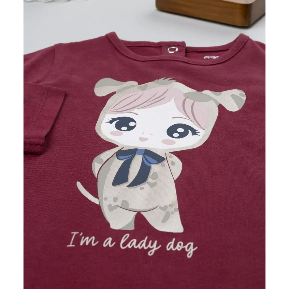La camiseta Lady Dog es una prenda con encanto para el día a día. De color burdeos y estampado de niña con su perrito, destaca por su dulzura y su estilo sencillo. El tejido 100% algodón aporta suavidad y confort, mientras que los botones automáticos en la espalda facilitan su uso.