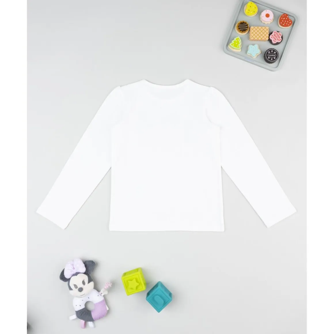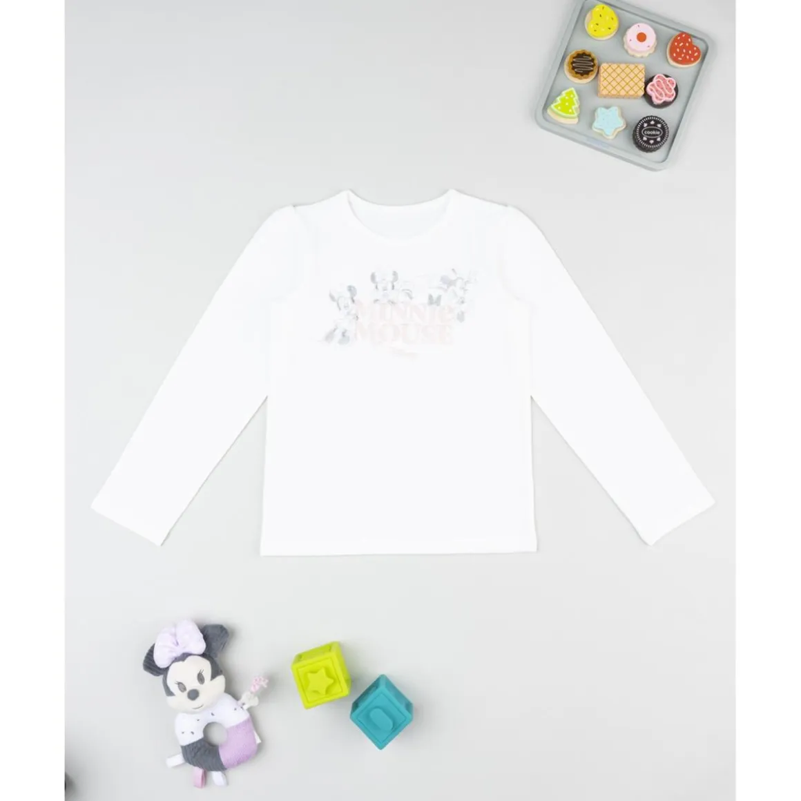 Camiseta de manga larga para niña, en blanco con ilustración estilizada de Minnie. Suave y cómoda, ideal para looks diarios.