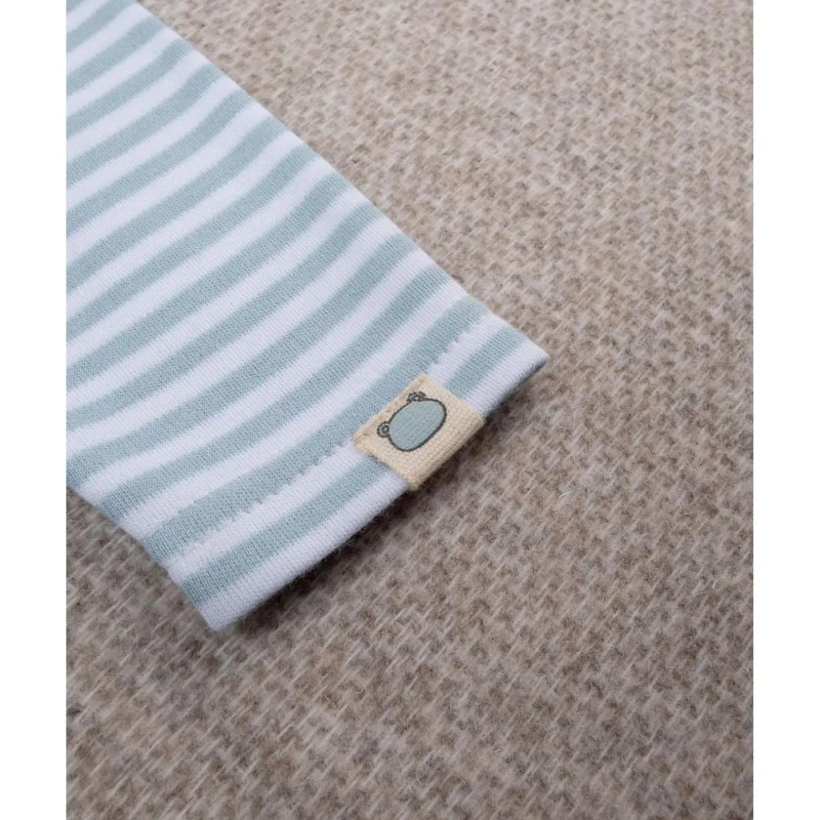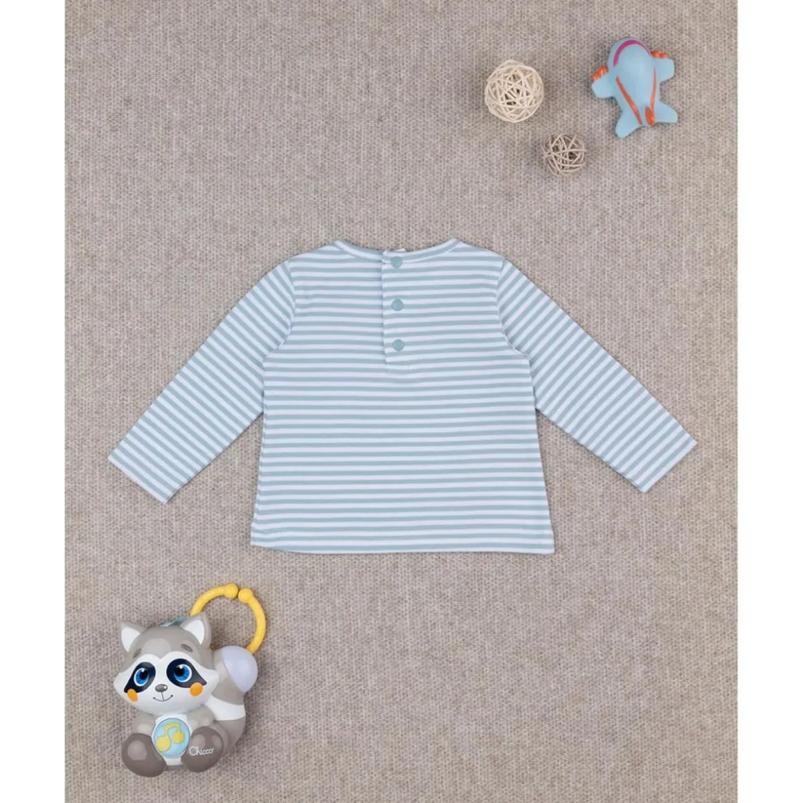 Camiseta básica de manga larga para niño con estampado de rayas azules. Ajuste cómodo con botones automáticos en la espalda. Ideal para ocasiones casuales y combinable. Algodón Oeko-Tex, seguro para la piel. Solo prenda incluida.
