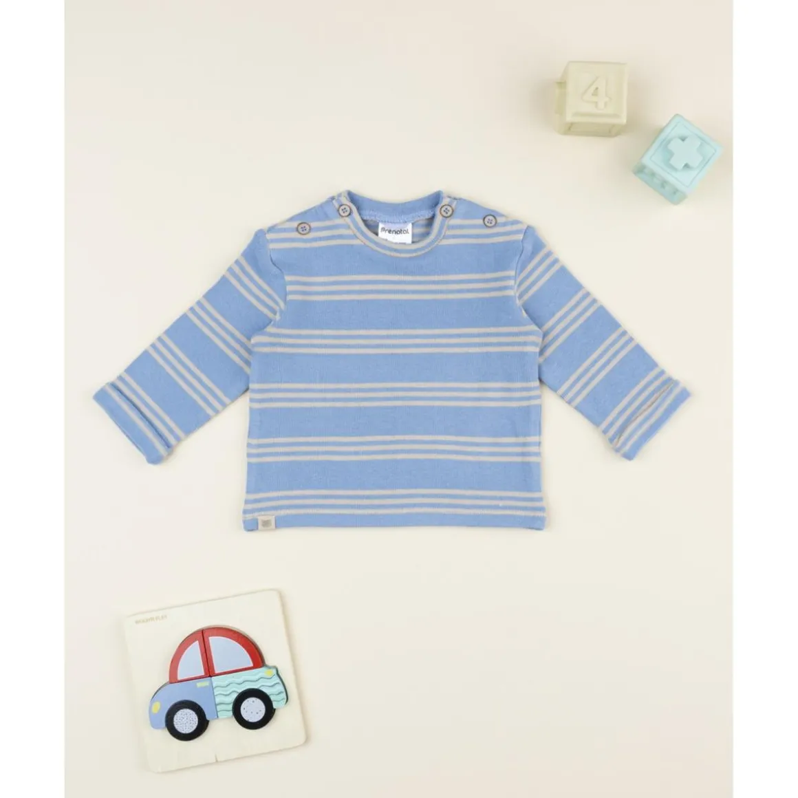 Suave camiseta de manga larga para niño con rayas en tonos azul y gris. De tejido elástico y certificado Oeko-Tex, es cómoda y segura para el uso diario.