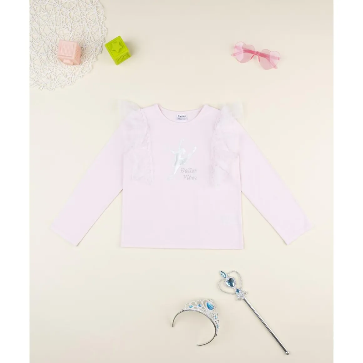 Esta camiseta de manga larga en rosa claro para niña luce un diseño encantador con estampado de bailarina y detalle de tul en el bajo. Confeccionada en algodón con elastano, combina suavidad y comodidad.