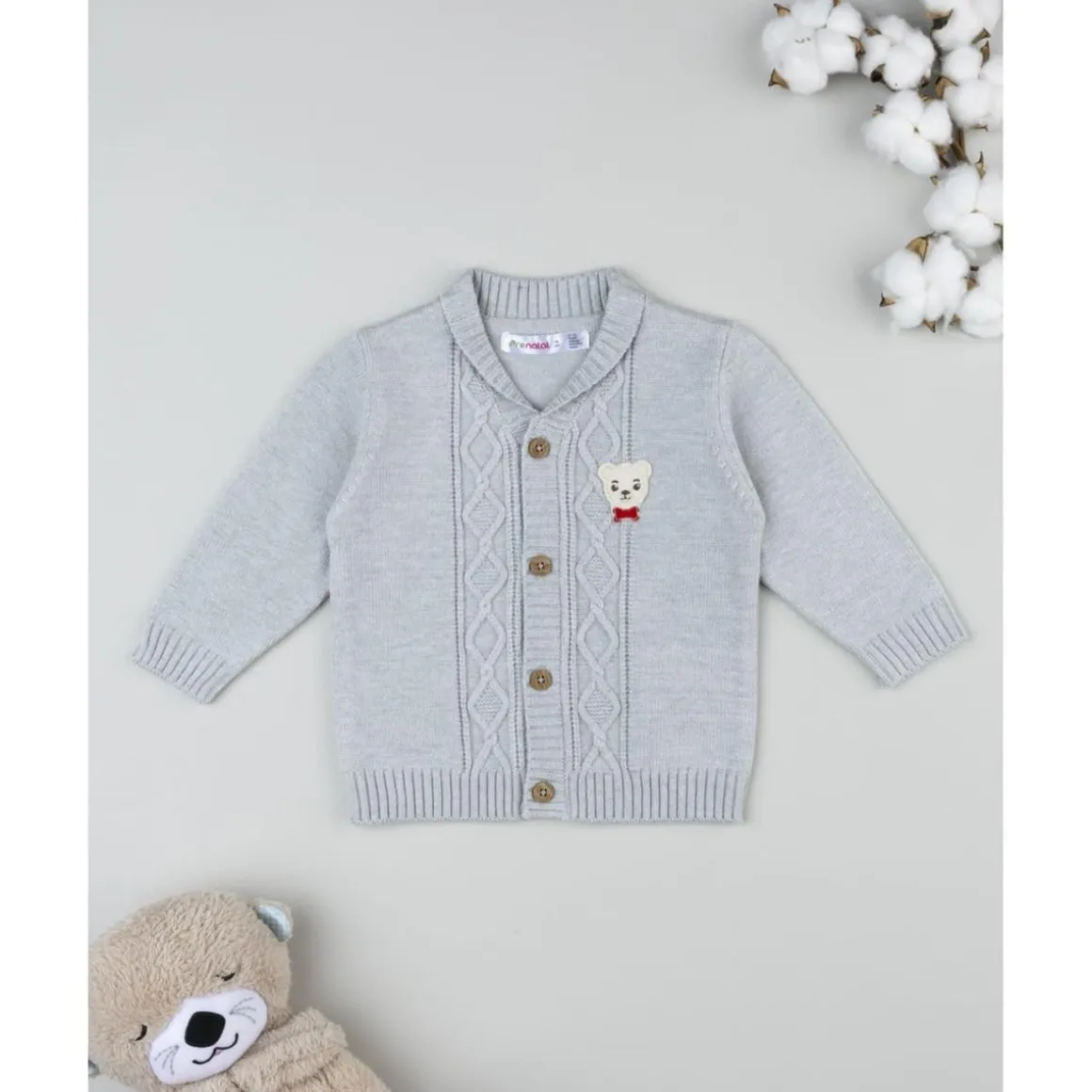 Suave cárdigan tricot para bebé niño en color gris claro con textura entrelazada y parche de osito sobre el pecho. Una prenda cálida y versátil ideal para combinar con cualquier look.