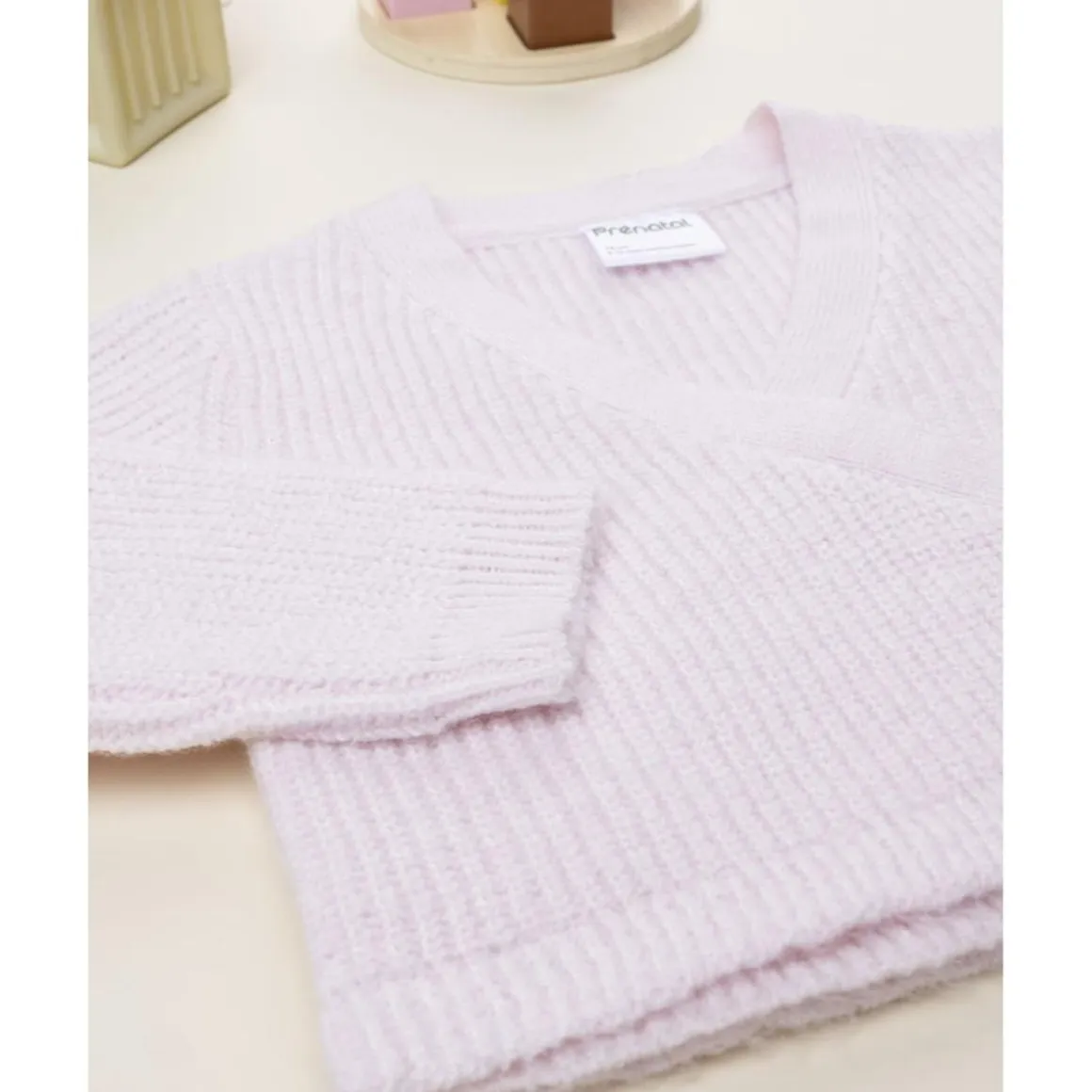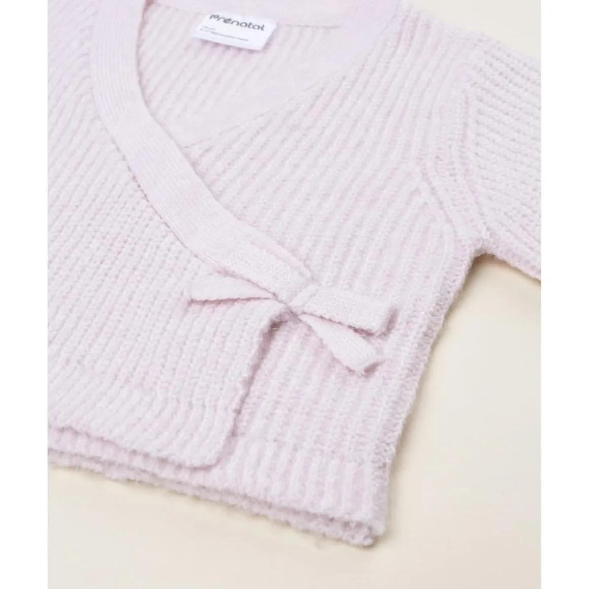 Dulce cárdigan tricot para niña en tono rosa claro, con corte cruzado y lazo decorativo en el mismo color. Su textura suave y su diseño versátil lo convierten en una prenda ideal para cualquier ocasión casual.
