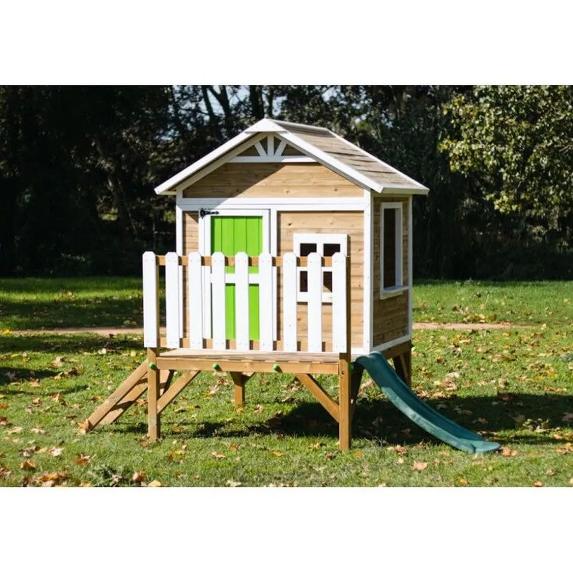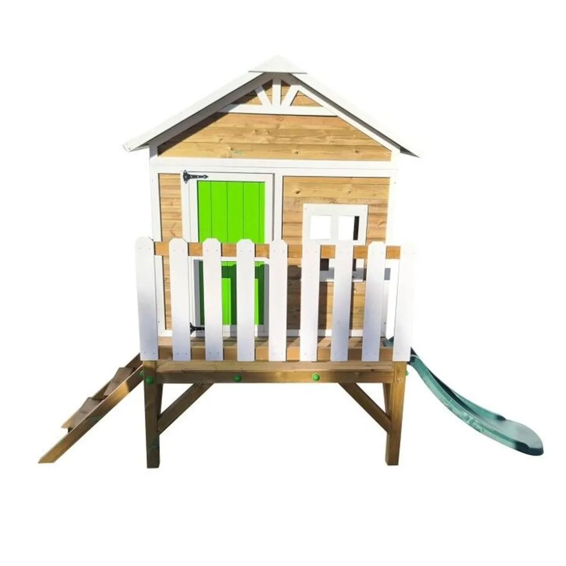 Gracias a su plataforma de 60 cm de altura, la casita queda aislada del suelo húmedo, prolongando la vida útil de la madera y aportando una nueva dimensión al juego. Además, existe la opción de adquirirla en otras versiones: sin plataforma o con altura de 90 cm, incluso con suelo de madera opcional si se instala a nivel del suelo.