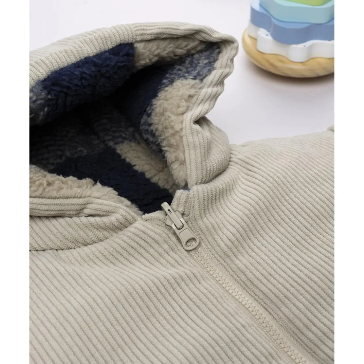 La chaqueta reversible beige con capucha es una prenda práctica y acogedora para los días más frescos. Su diseño reversible ofrece dos estilos en uno: un lado de tejido acanalado en beige y otro más cálido en tejido polar. Cuenta con cierre de cremallera frontal y bolsillos de parche, combinando funcionalidad y estilo.