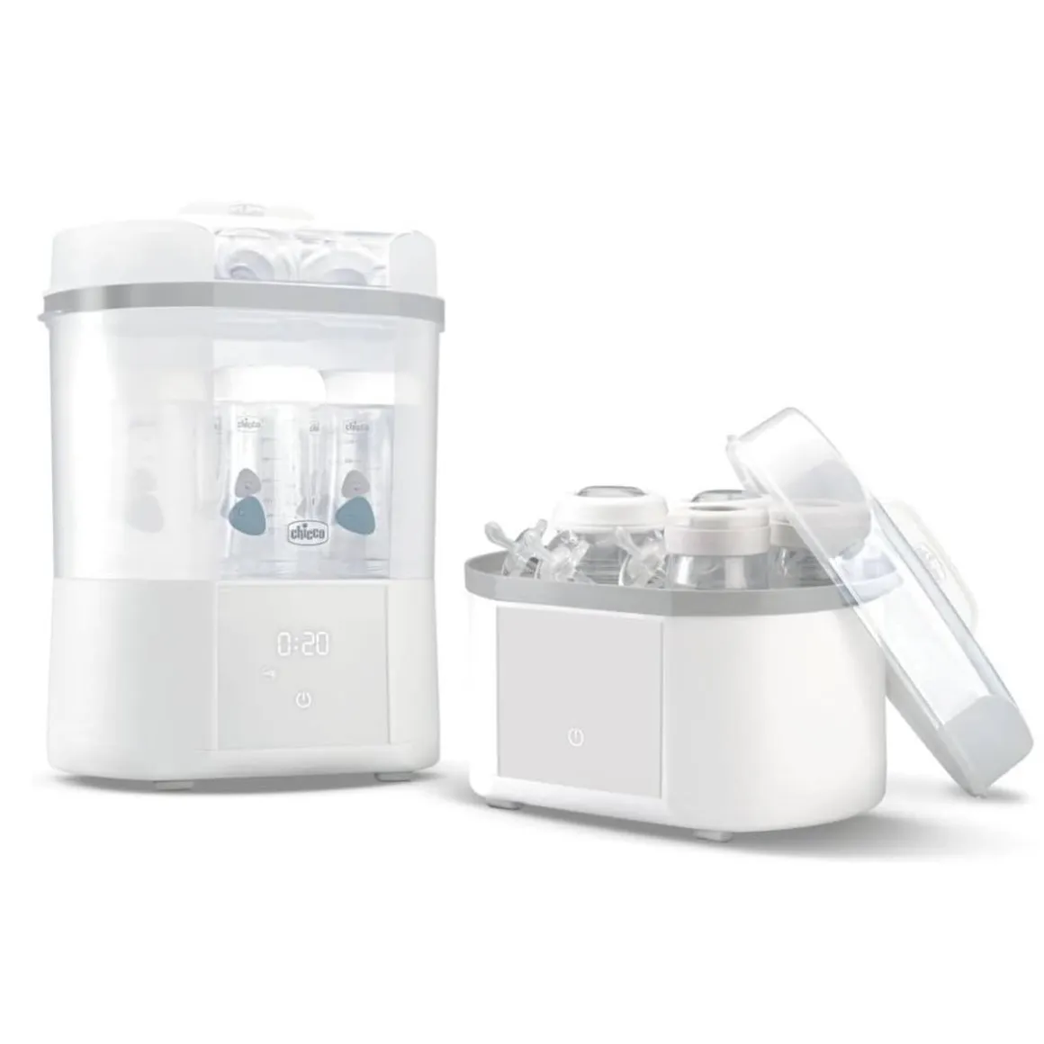 El Esterilizador con secador All in One de Chicco es la solución definitiva para mantener los utensilios de tu bebé impecablemente limpios y listos para usar en todo momento. Este innovador dispositivo combina la esterilización y el secado en un solo aparato, eliminando el 99,9% de los gérmenes y bacterias presentes en biberones, chupetes y otros accesorios. Su diseño modular ofrece dos configuraciones: el modo completo, que permite esterilizar hasta seis biberones y pequeños accesorios, y el modo compacto, ideal para dos biberones, un sacaleches o chupetes, adaptándose a tus necesidades diarias.