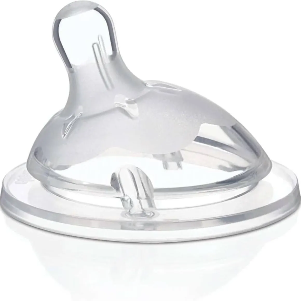 El diseño de esta tetina incluye anillos en relieve que simulan el seno materno y una inclinación que garantiza que la tetina esté siempre llena de leche, favoreciendo la postura correcta del cuello y reduciendo la presión en la mandíbula del bebé.