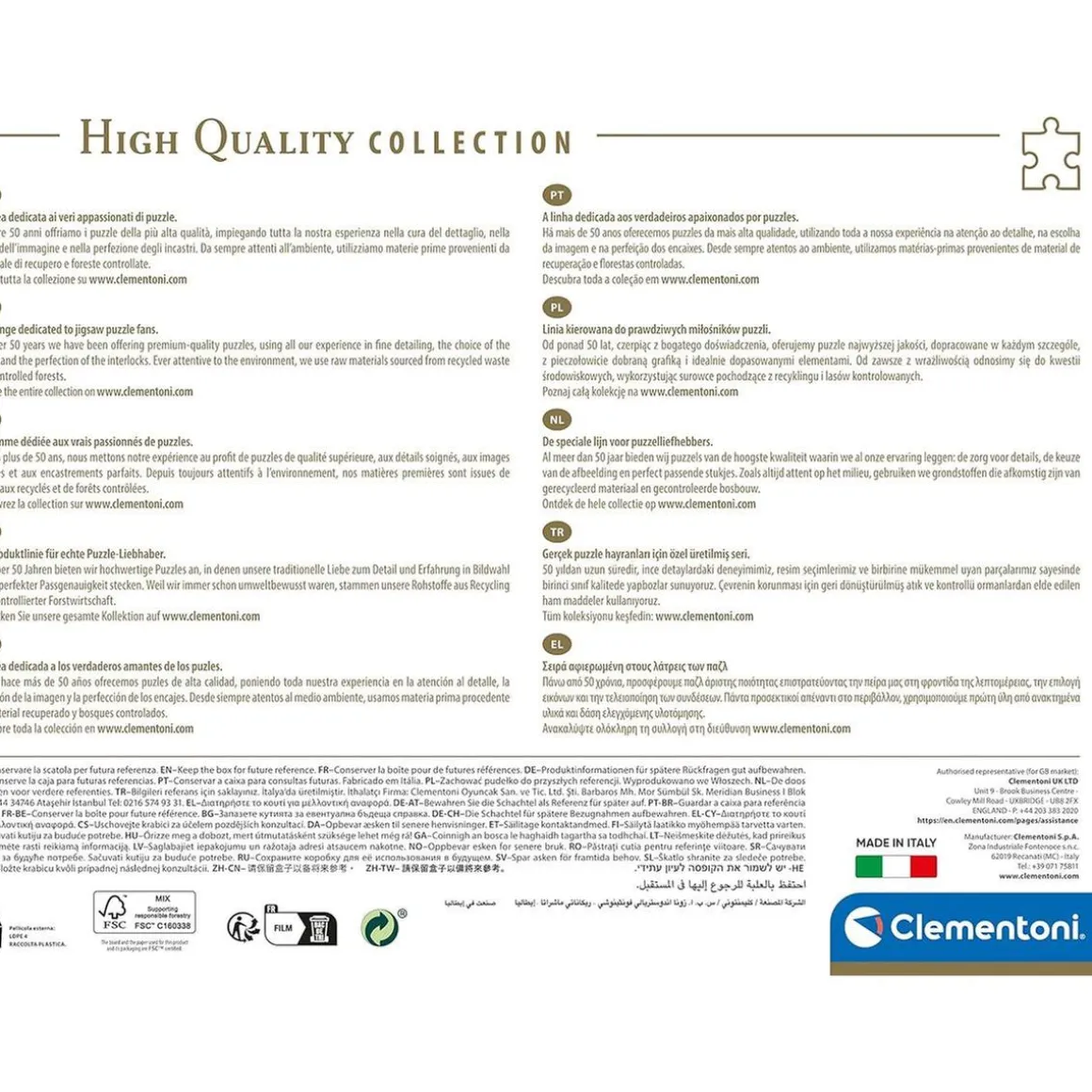 Como todos los productos de Clementoni, este rompecabezas ha sido creado con los más altos estándares de calidad. Las piezas se cortan con precisión para asegurar que encajen perfectamente, y la impresión de alta calidad hace que los colores resalten y den vida al rompecabezas.