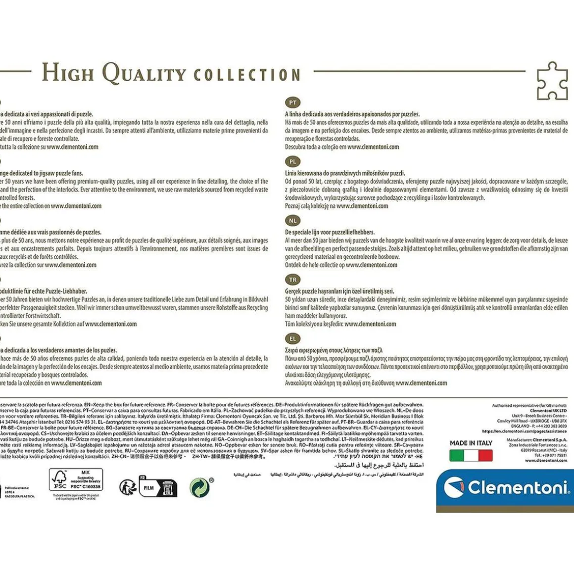 Los puzzles de Clementoni no solo ofrecen horas de diversión y entretenimiento, sino que también son amigables con el medio ambiente. Este puzzle de 1000 piezas de One Piece, al igual que el resto de la colección de Anime de Clementoni, está hecho de materiales reciclables. Además, la firma italiana ofrece un servicio de asistencia para «piezas perdidas», para que nada te impida completar tu aventura.