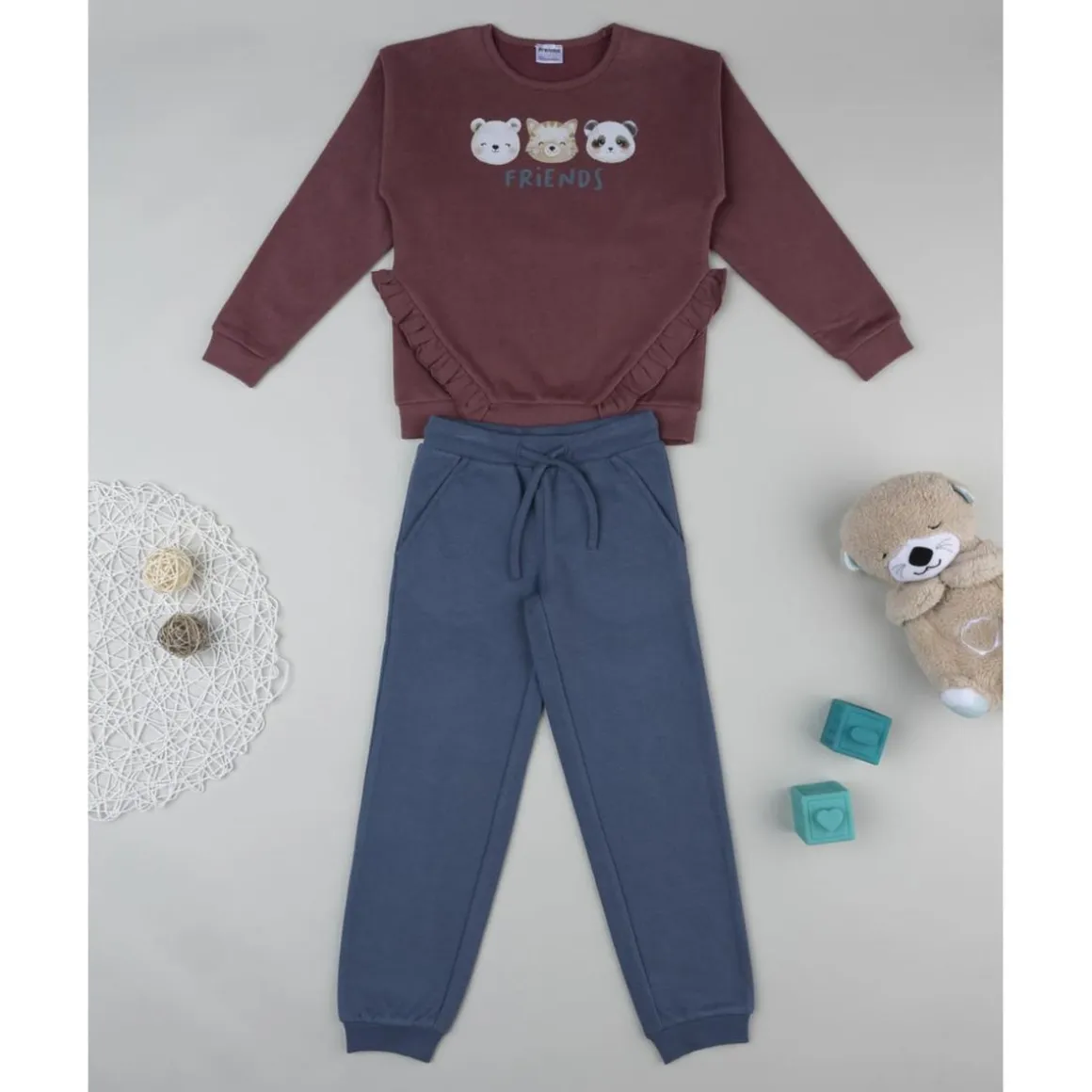 Conjunto casual para niña compuesto por sudadera burdeos de cuello redondo con estampado frontal y volantes diagonales, y pantalón azul liso con cintura ajustable mediante cordón y bajos elásticos. Un binomio cómodo para el cole y el tiempo libre, con color y detalles que elevan el look sin renunciar al confort.