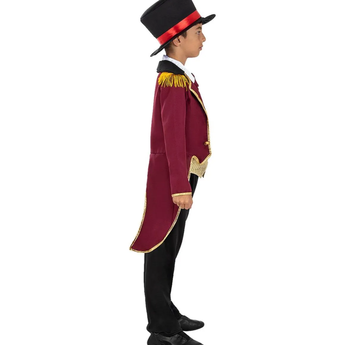 Este disfraz de domador infantil hará que tu peque se vea imponente con su levita roja con detalles dorados, pantalón negro, pechera blanca con pajarita y un sombrero de copa negro. ¡El look perfecto para dirigir su propio circo!