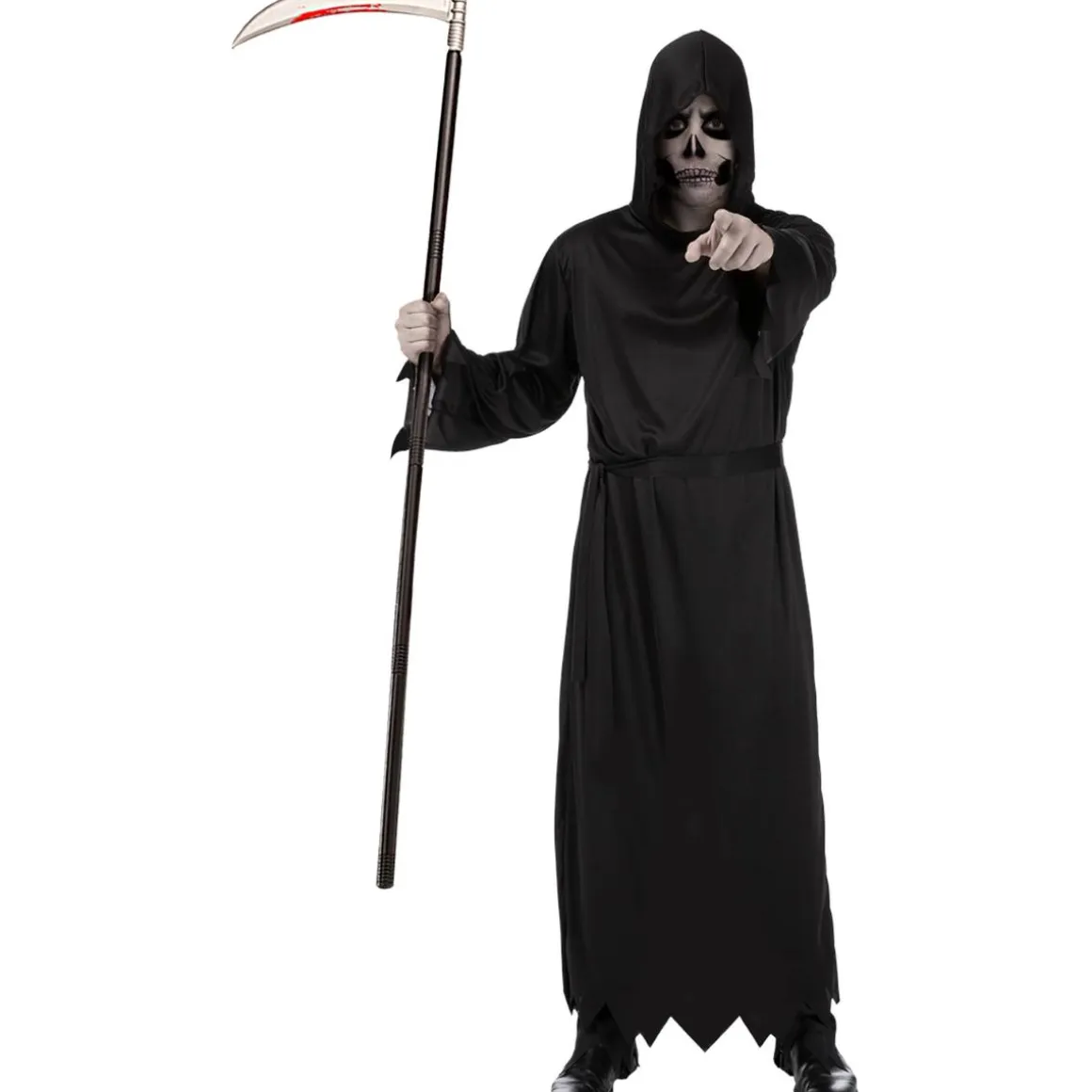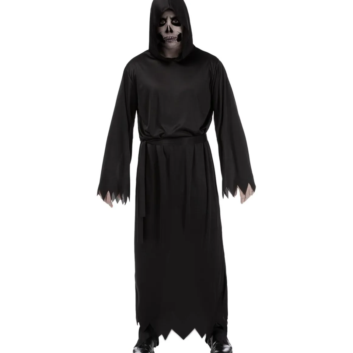Este disfraz de la Muerte en talla única incluye túnica con capucha y cinturón, logrando un conjunto oscuro y espeluznante. Su diseño atemporal convierte a quien lo lleva en un personaje inquietante.