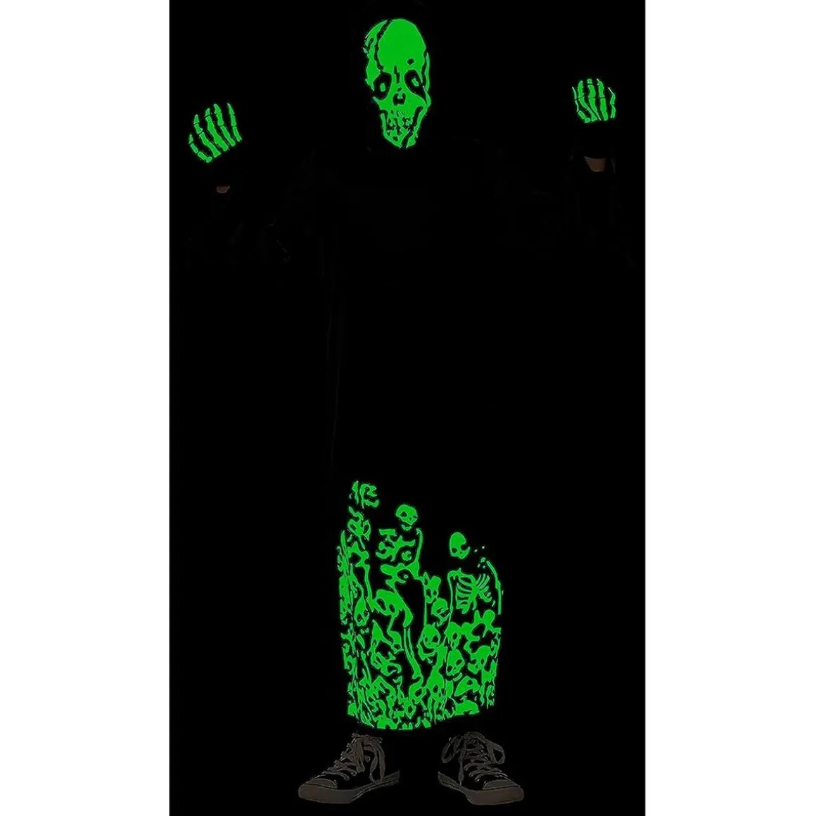 El disfraz de Esqueleto Siniestro incluye un increíble mono tipo túnica con un estampado de esqueleto que brilla en la oscuridad. Este jumpsuit, con cierre tipo pull on, viene debidamente empaquetado en una bolsa de percha para garantizar su perfecto estado. Pero eso no es todo, para completar este mortífero aspecto, también incluimos una capucha y unos guantes a juego. Su efecto glow in dark potenciará su efecto brillante en la oscuridad, haciendo que tu pequeño se convierta en el centro de atención de cualquier festividad.