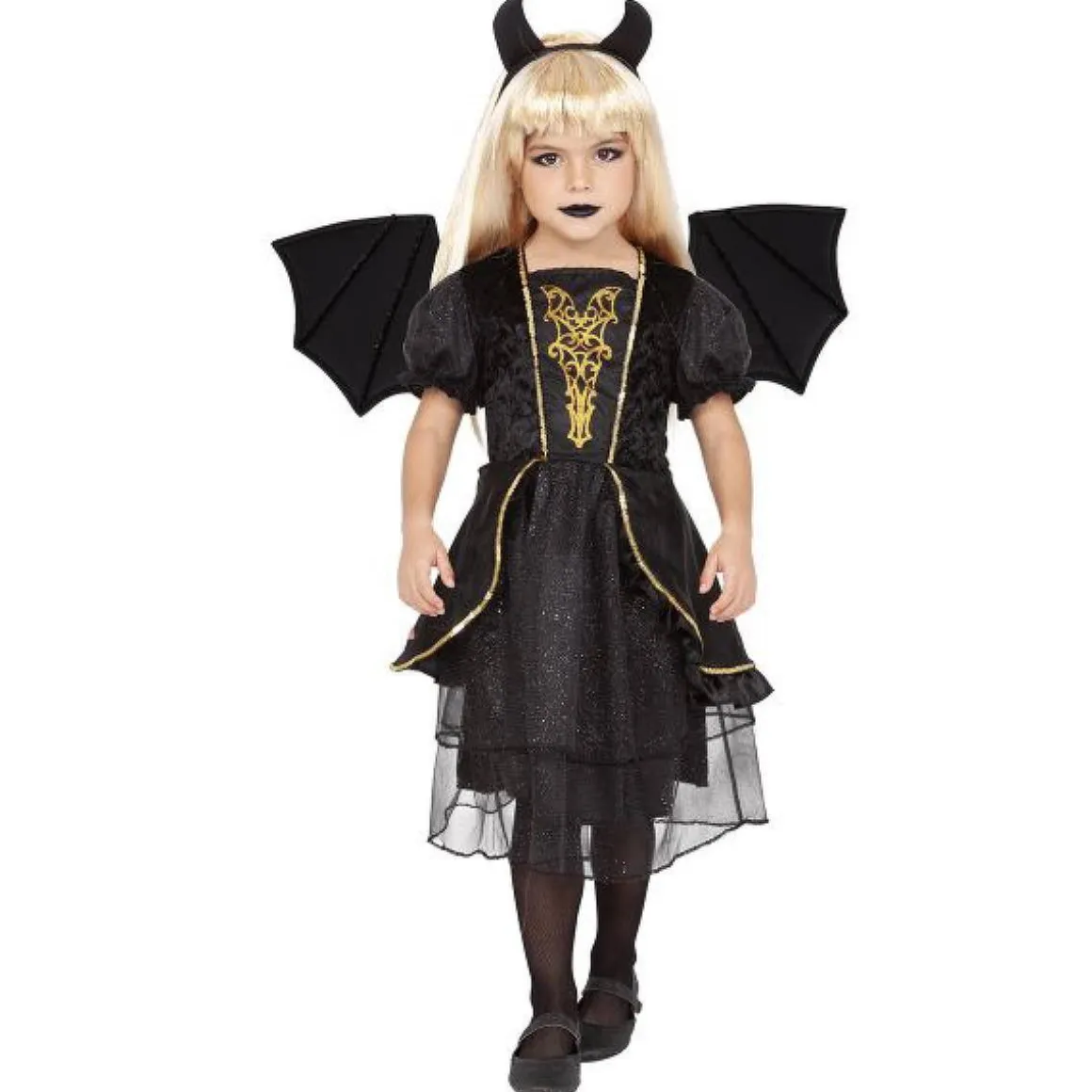 - Incluye: Vestido negro con detalles dorados, alas y diadema con cuernos.