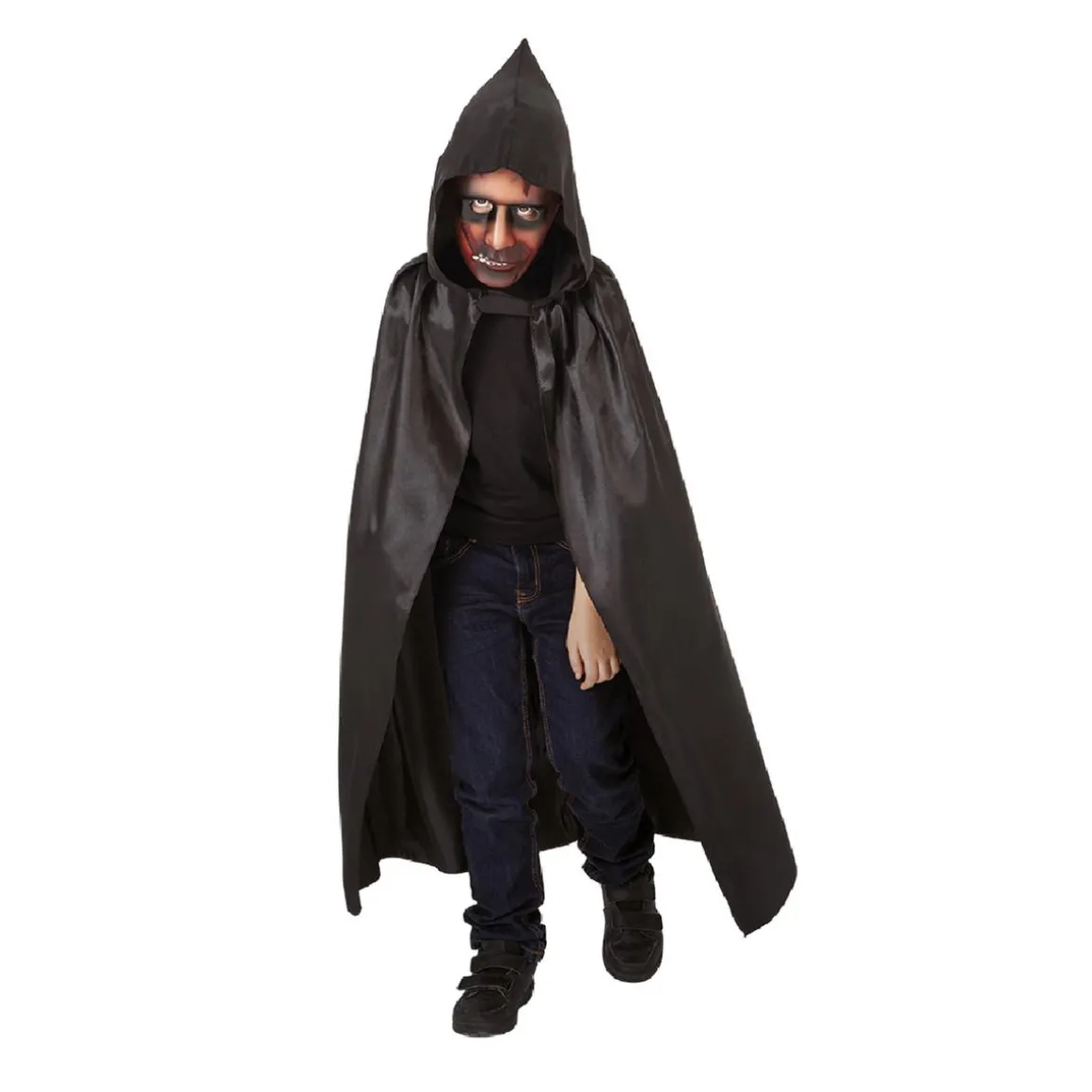 Está fabricado en satén y PVC, y se compone de capa con capucha y máscara.
