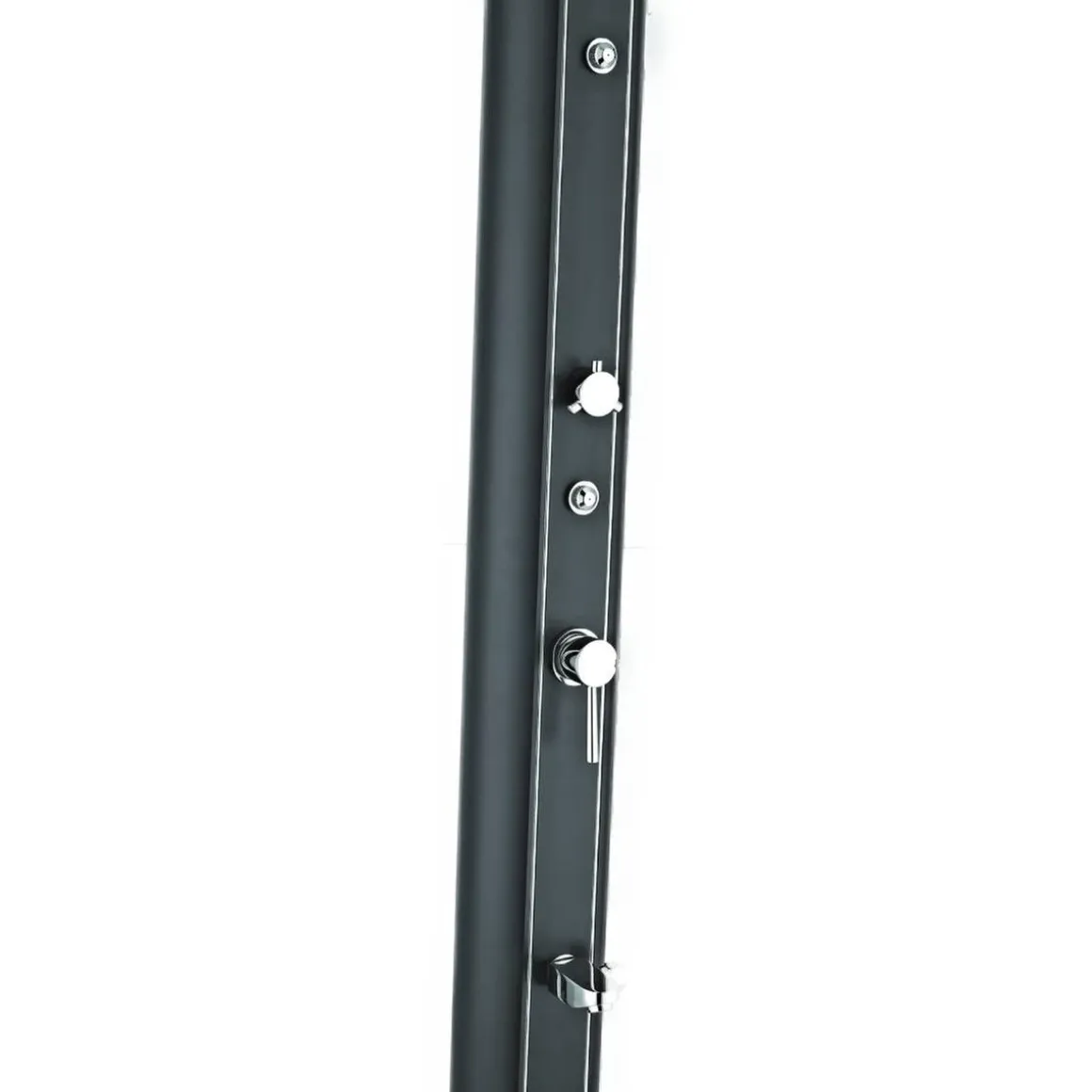 Ducha solar aluminio acabado negro con lavapiés 32L, una ducha para el jardín que calienta el agua gracias a la energía solar y no consume electricidad.