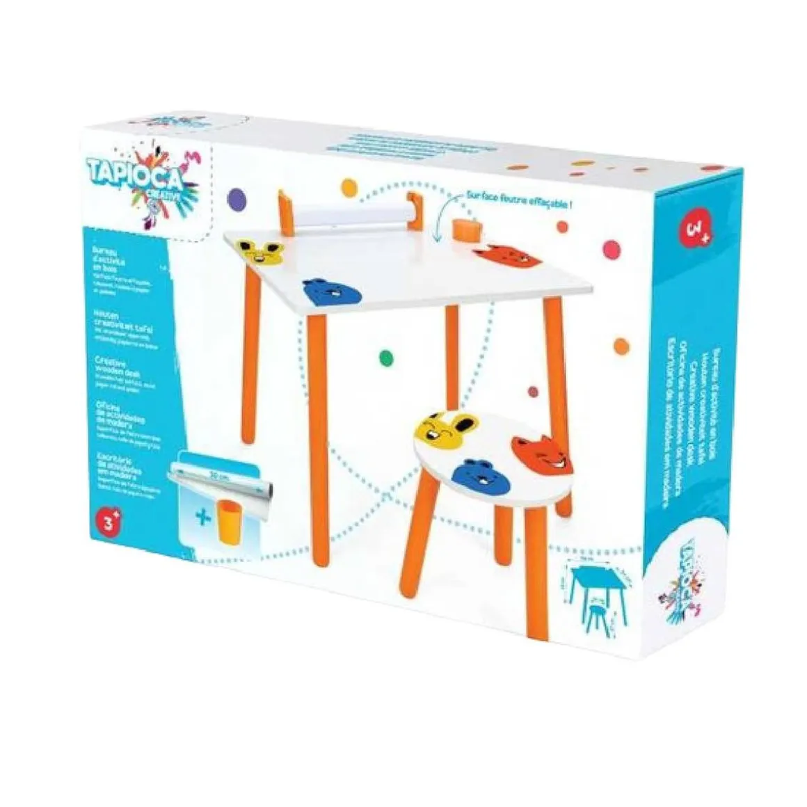 El escritorio tiene una superficie blanca borrable, por lo que los pequeños artistas pueden dibujar sobre él y borrar sus dibujos para hacer otros. También hay un pequeño dispensador de papel al final del escritorio para que los niños puedan dibujar sin parar. También se incluye una pequeña taza para que los artistas guarden todos sus accesorios de dibujo.