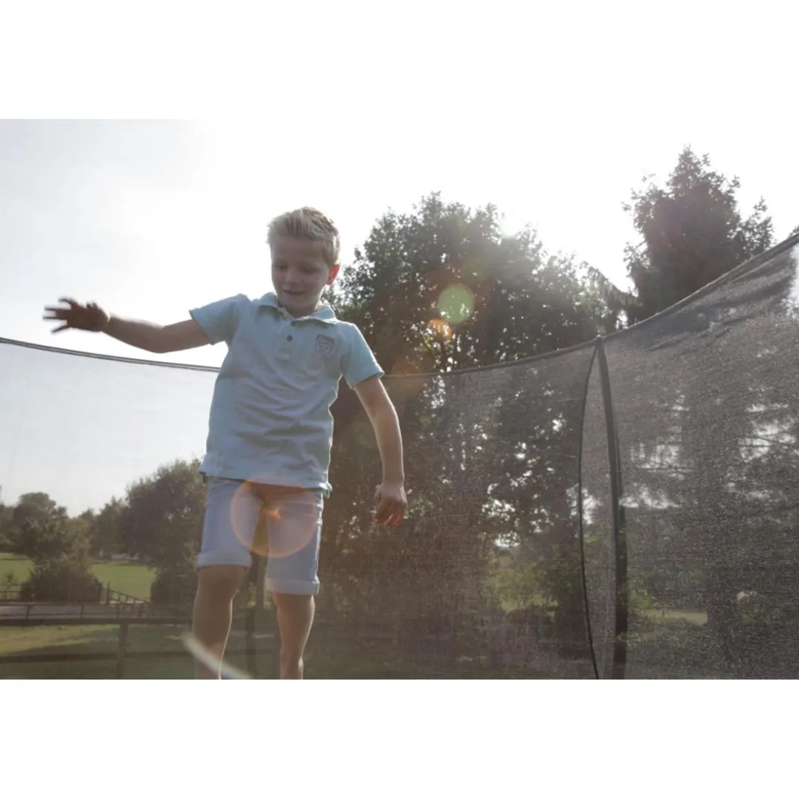 El trampolín Exit Silhouette en el suelo con red de seguridad es un trampolín redondo de buena calidad.